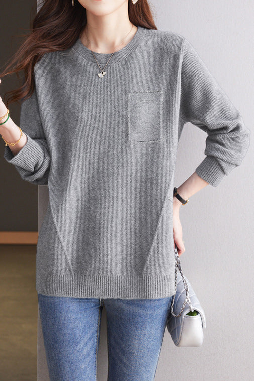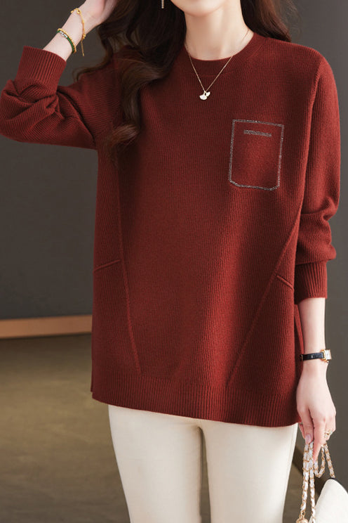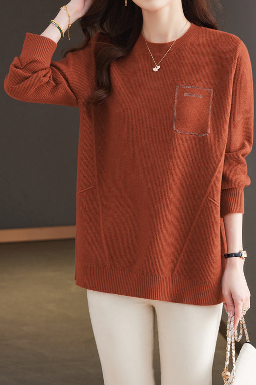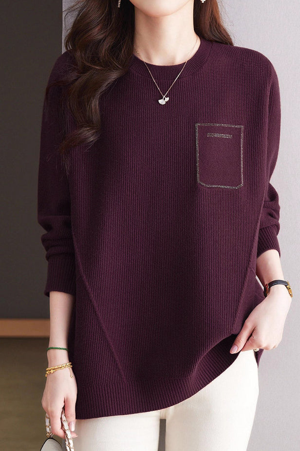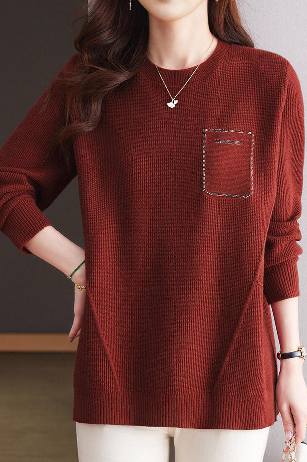 Casual Minimalist Pullover Crew Neck Long-Sleeve Rhinestone-Appliquéd Sweater