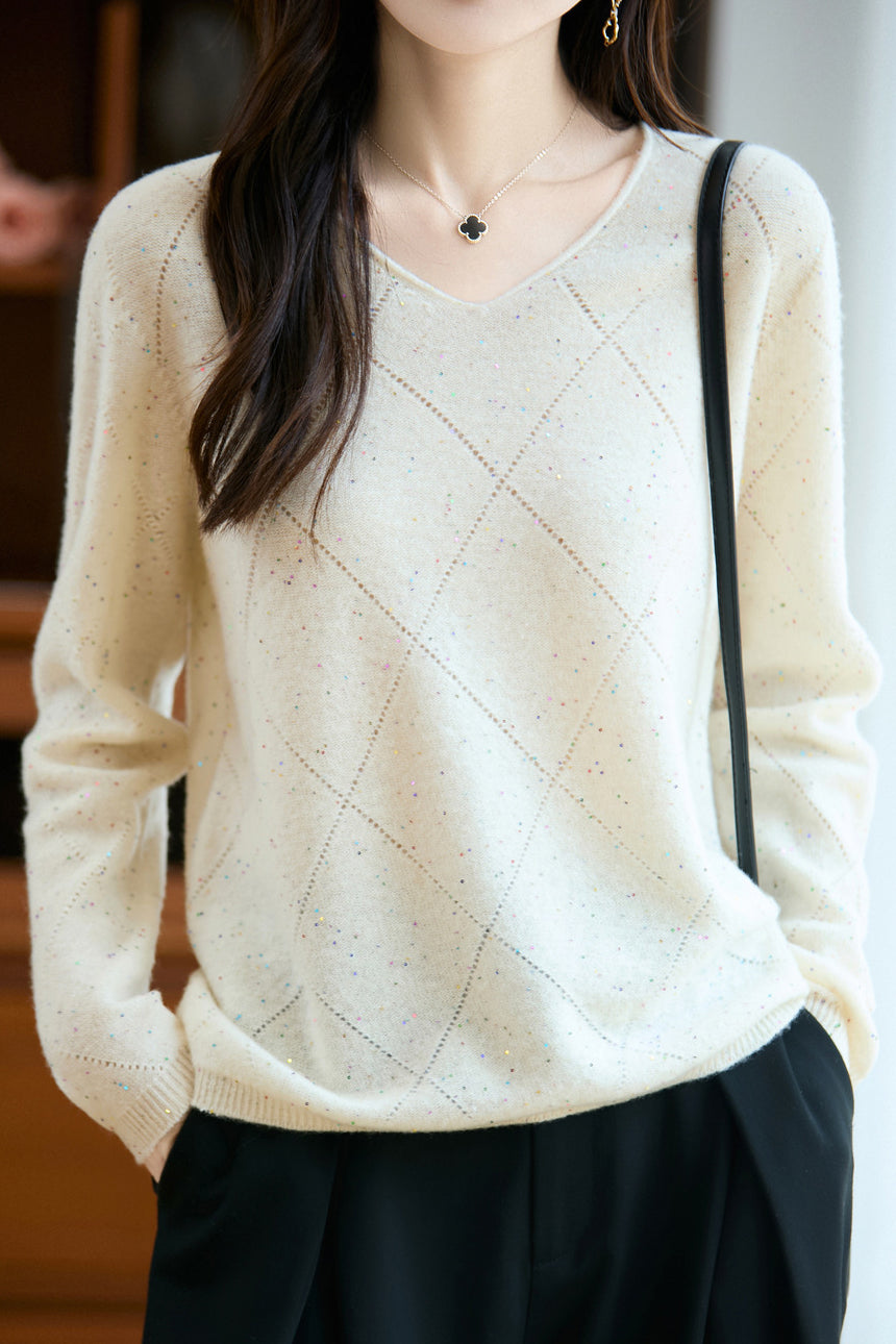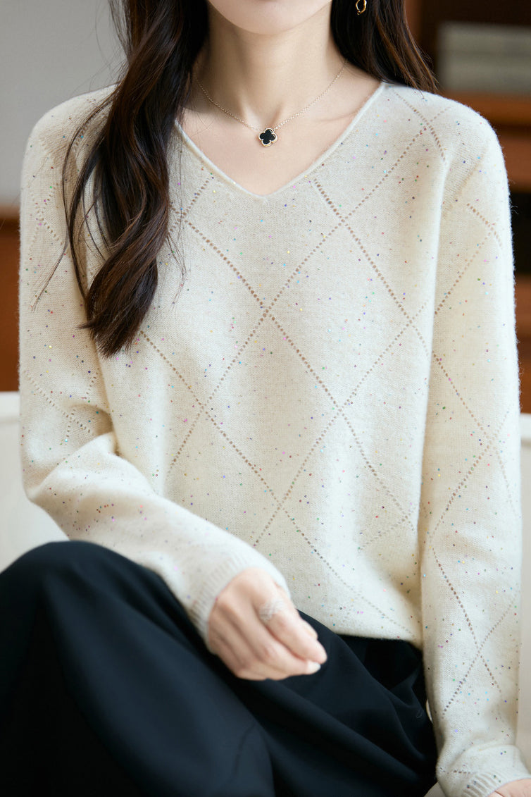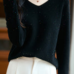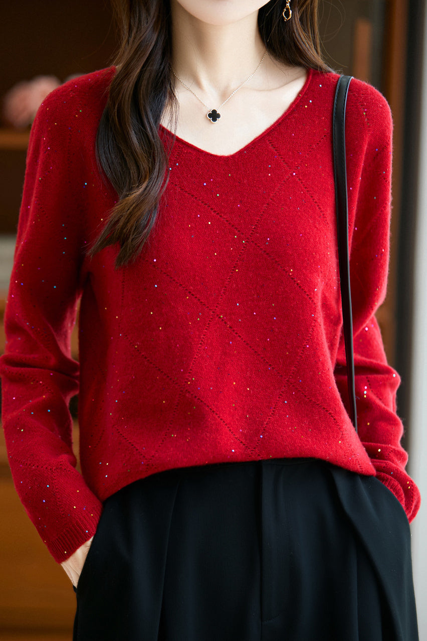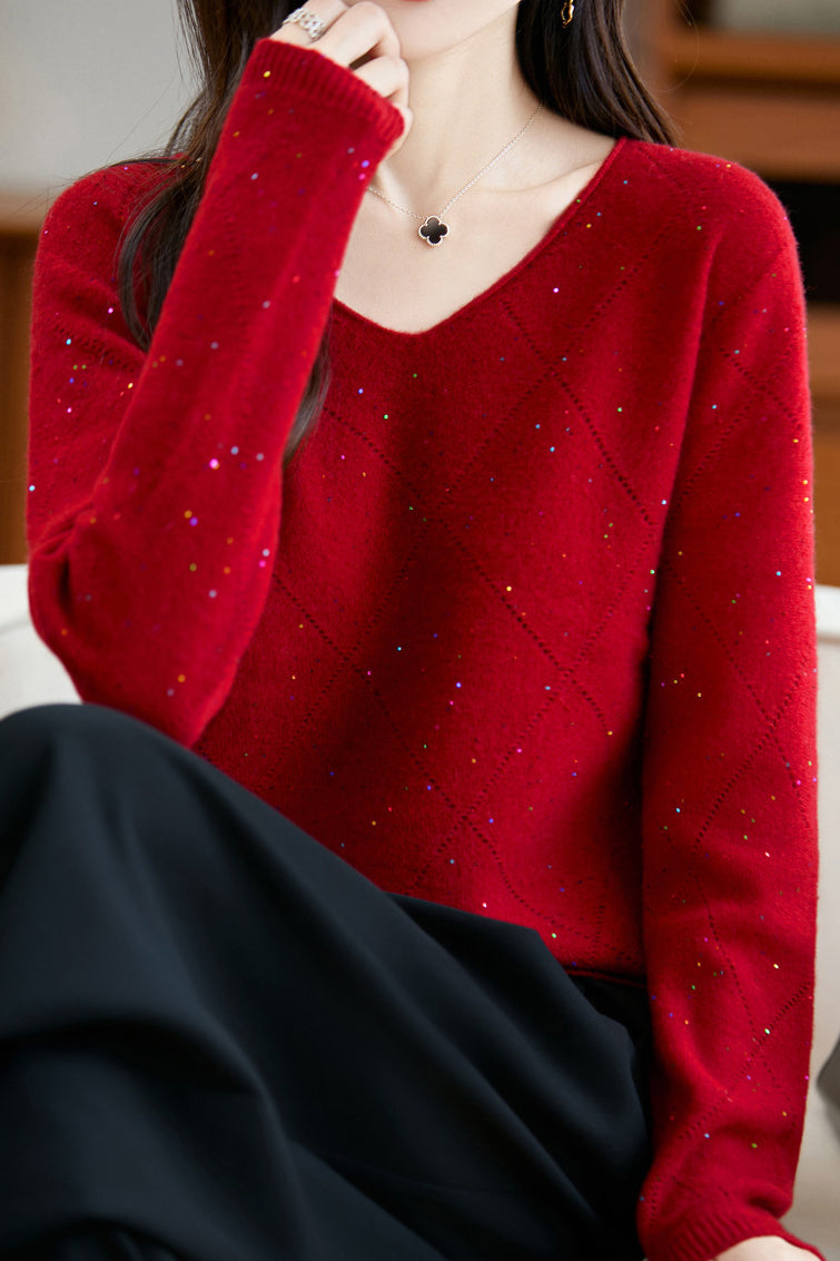 Casual Versatile Argyle Ribbed Sequin V-Neck Long-Sleeve Knitted Top