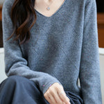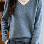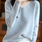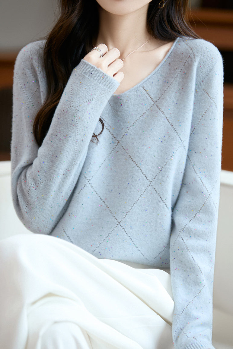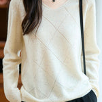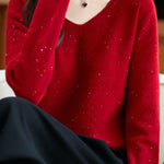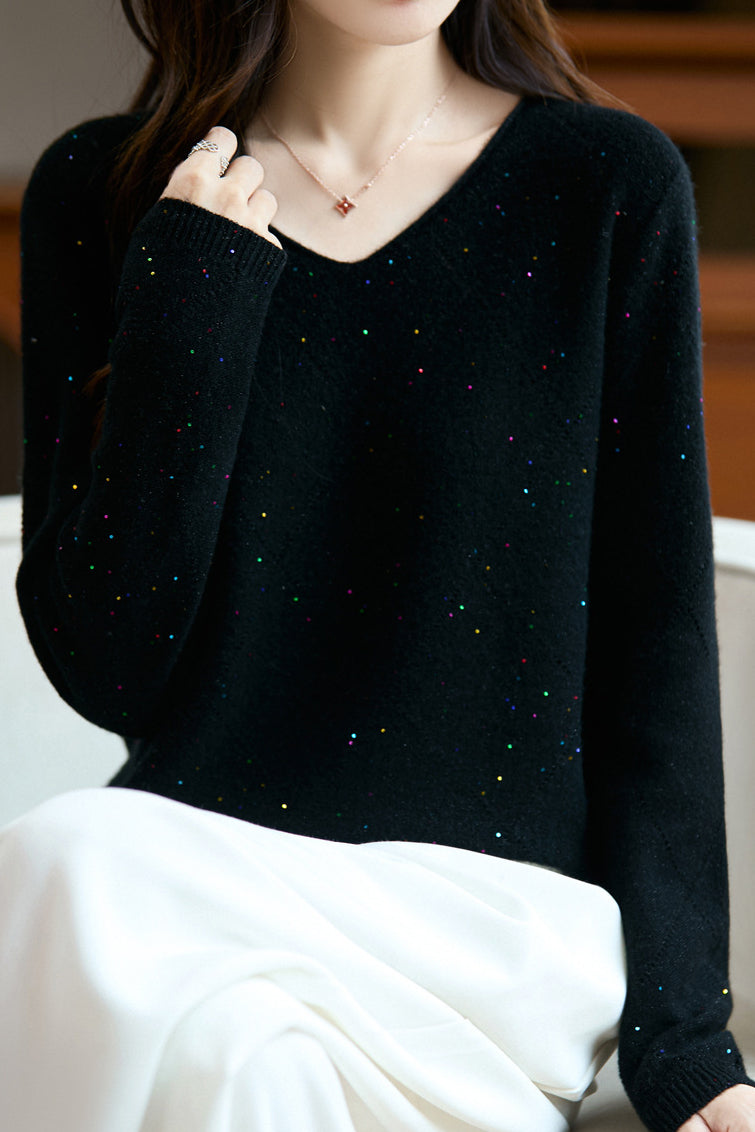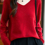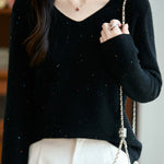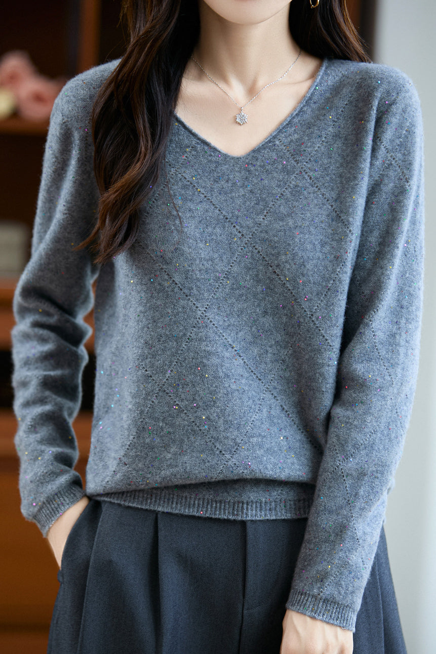 Casual Versatile Argyle Ribbed Sequin V-Neck Long-Sleeve Knitted Top