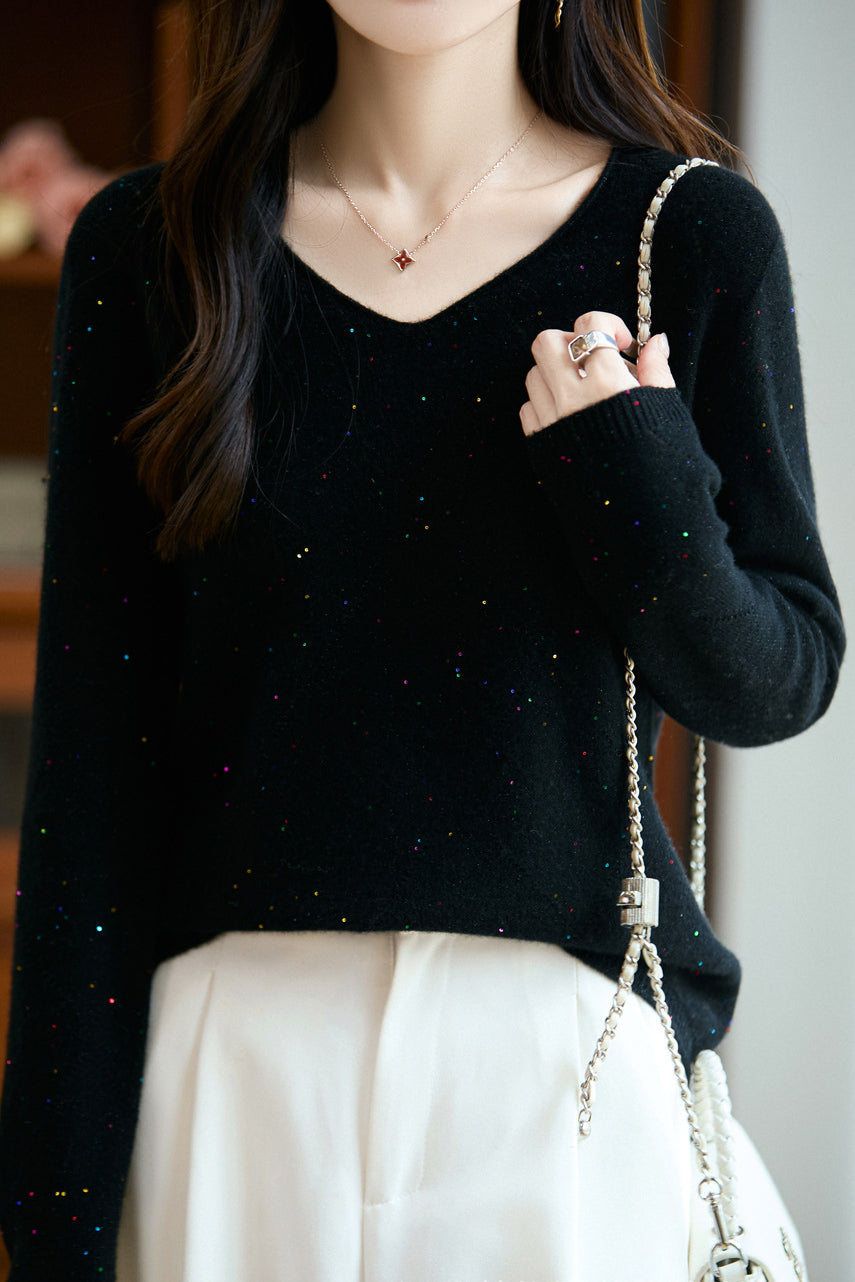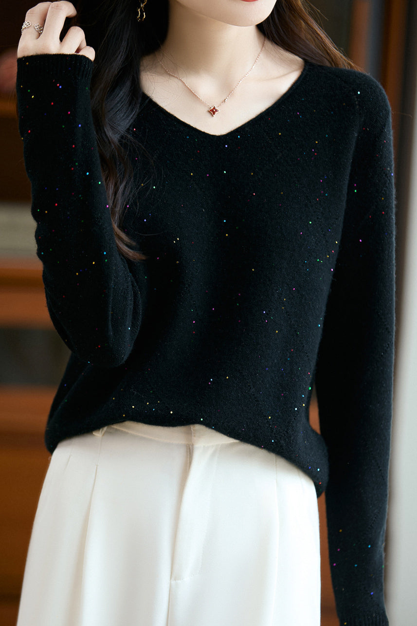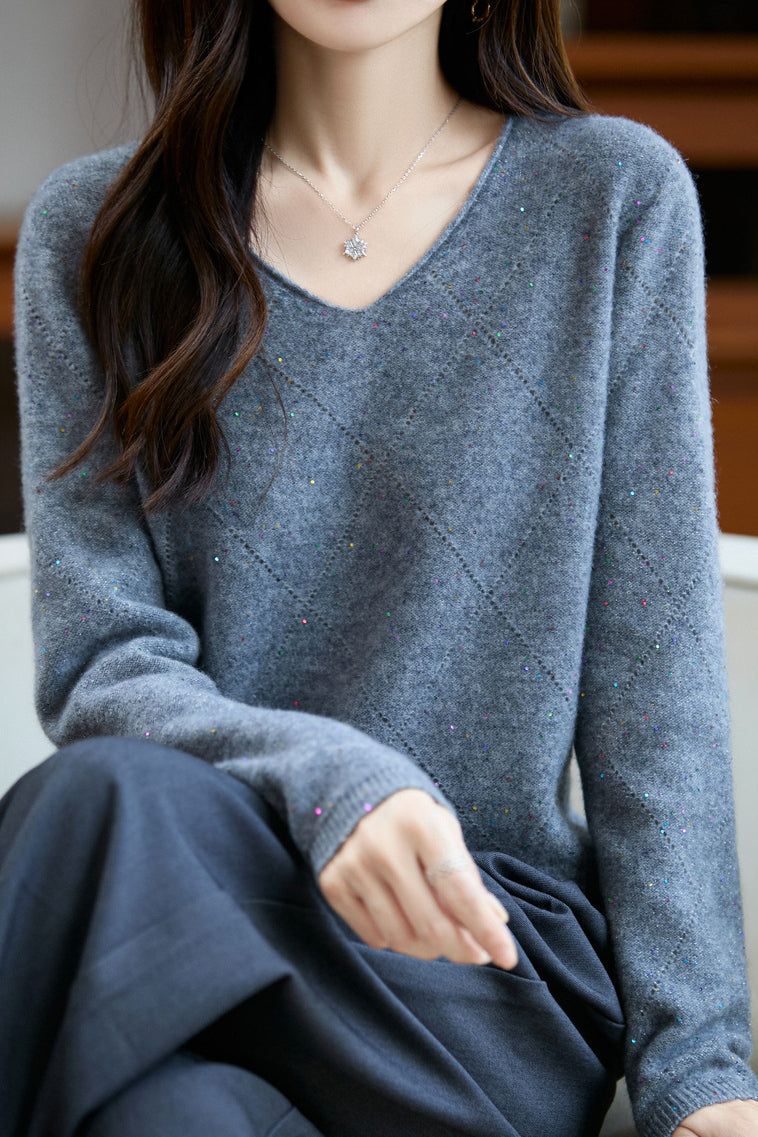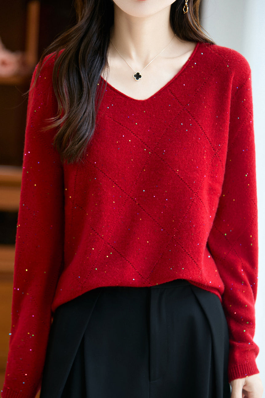 Knitted top,pullover v-neck long-sleeve loose fit,argyle ribbed design,body embellished with sequins |