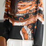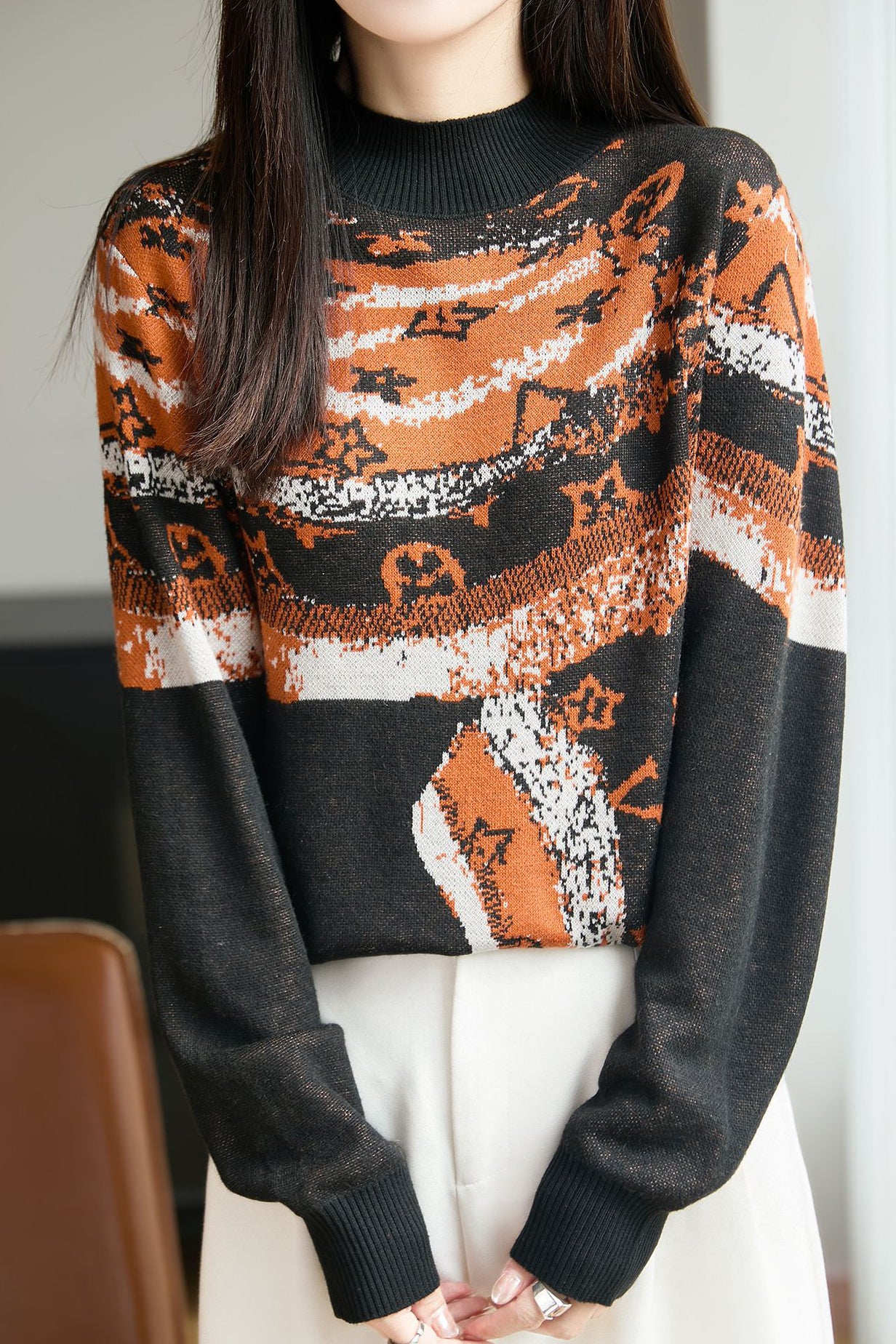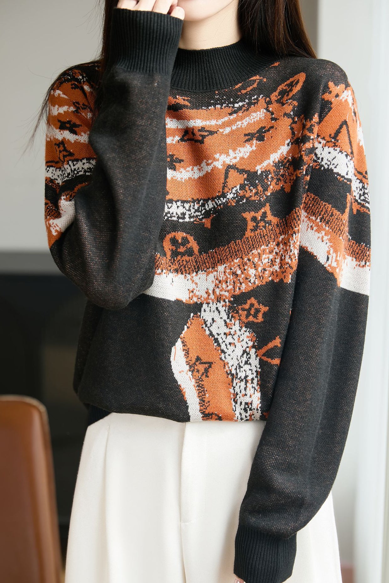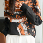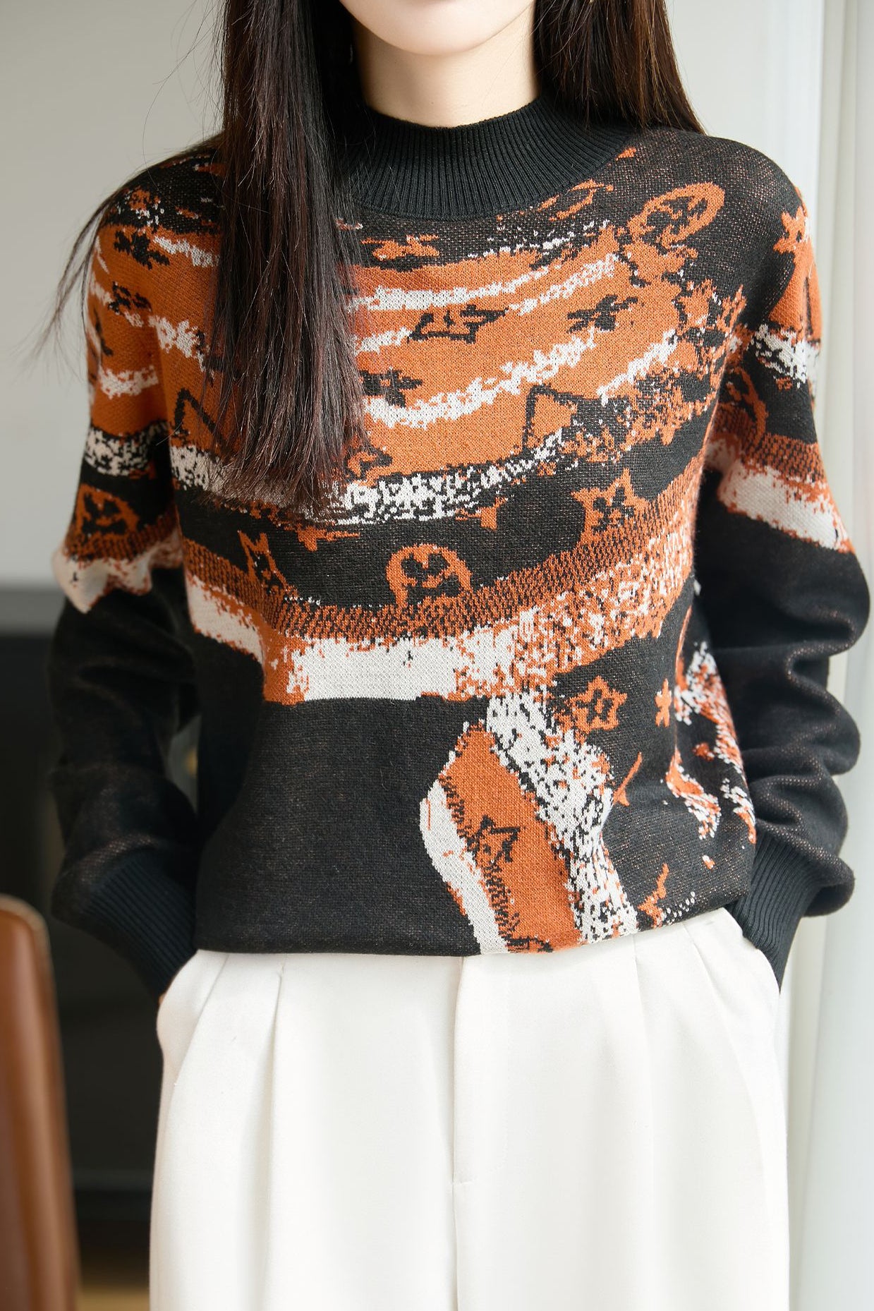 Pullover sweater,half-high neck long-sleeve loose fit,body with irregular geometric pattern and color-block design in orange,black and white |