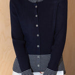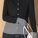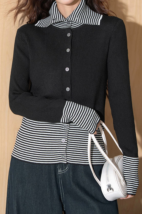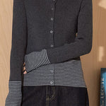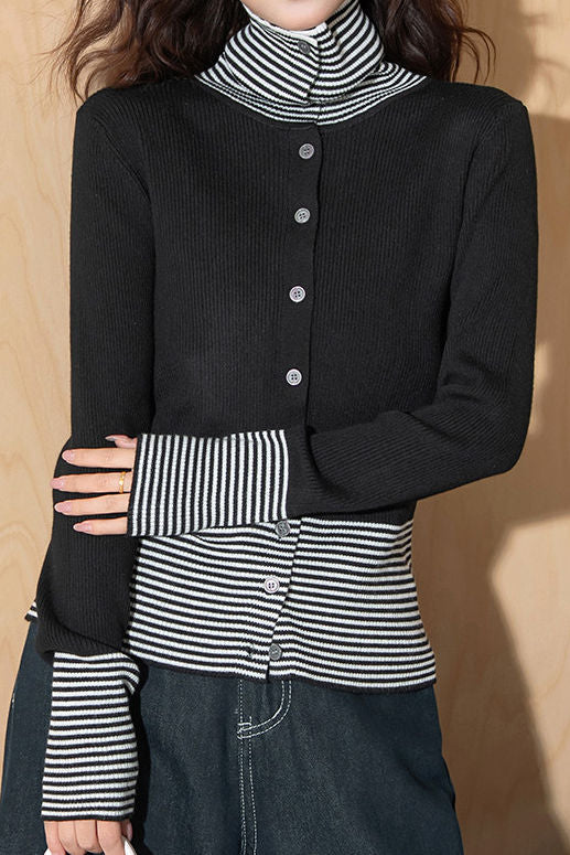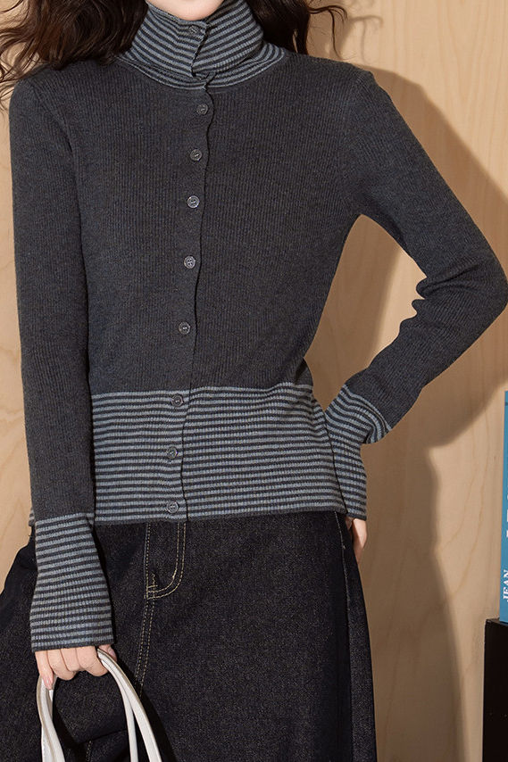Knitted cardigan, high-neck long-sleeve slim fit, striped paneled design, front placket buttons unbuttonable |