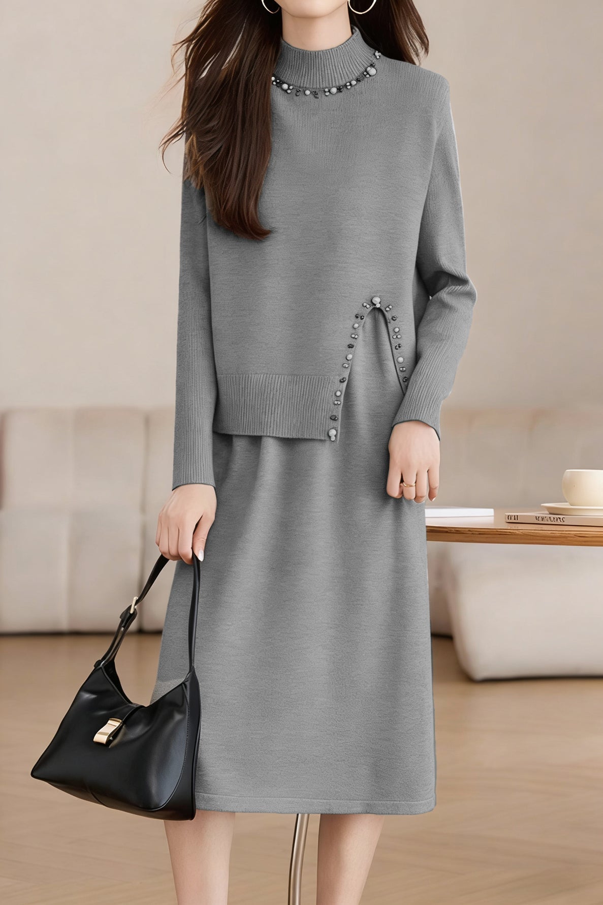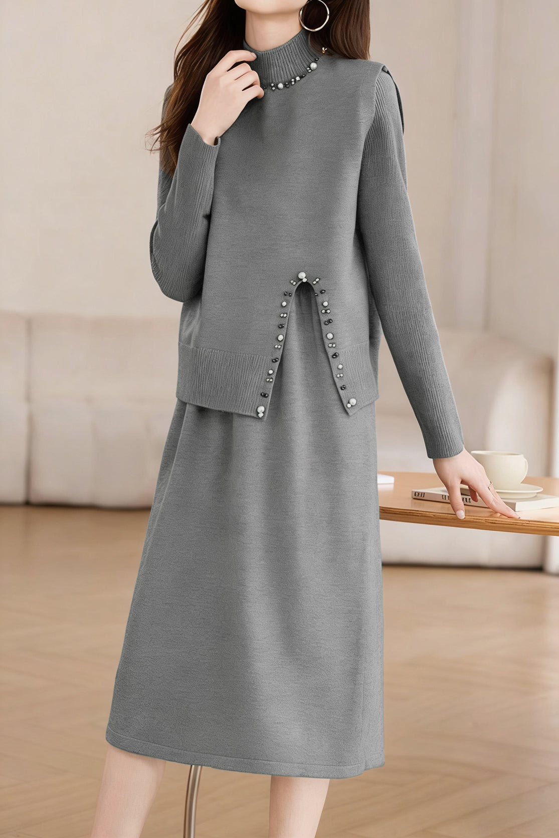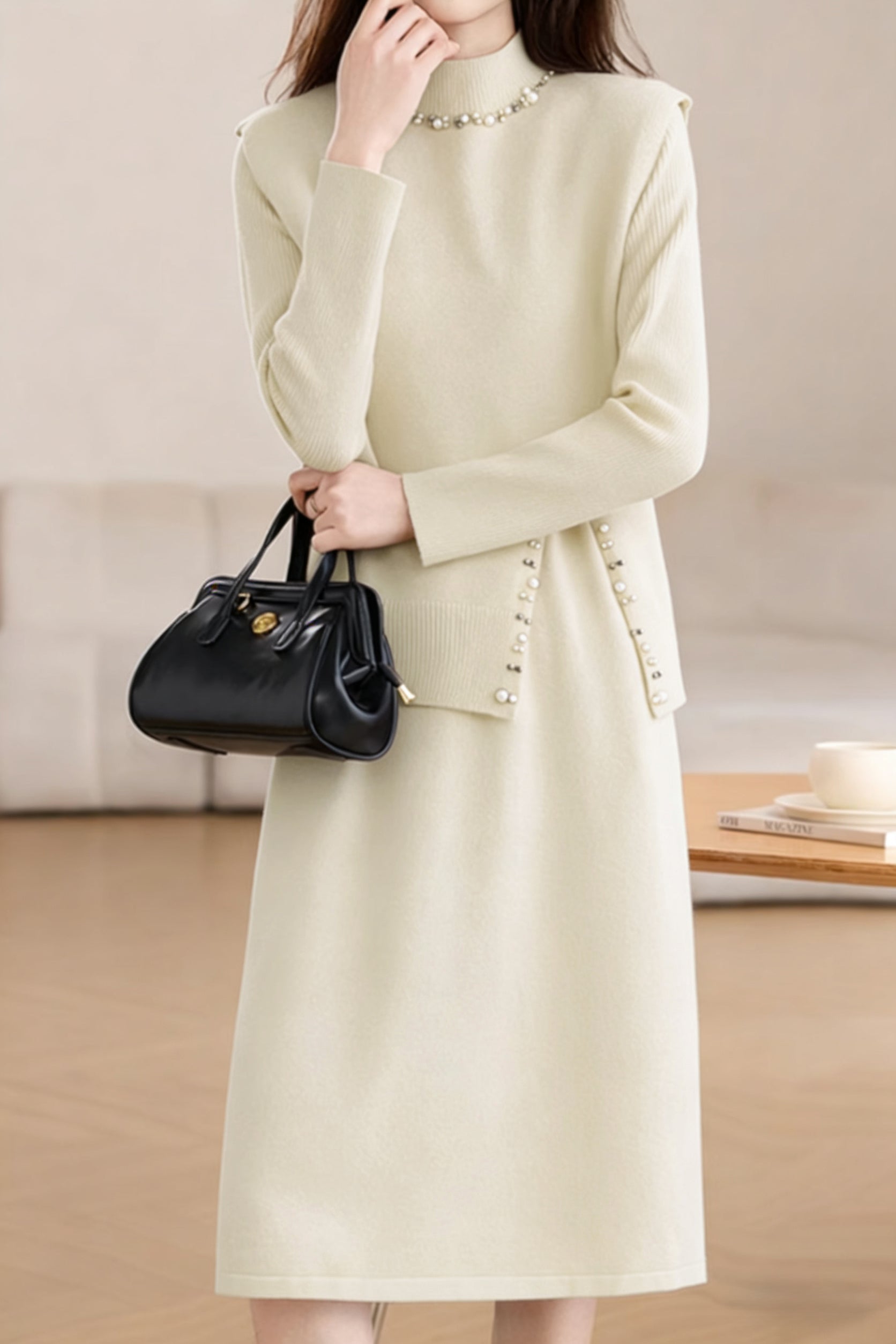 Dress, half-high neck design, neckline and sides decorated with decorative details for refinement, soft and delicate fabric, coordinated and neat fit of top and bottom |