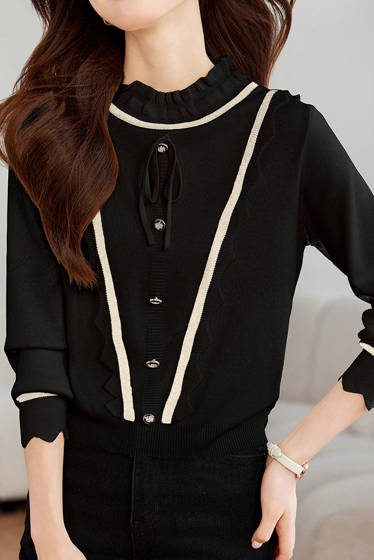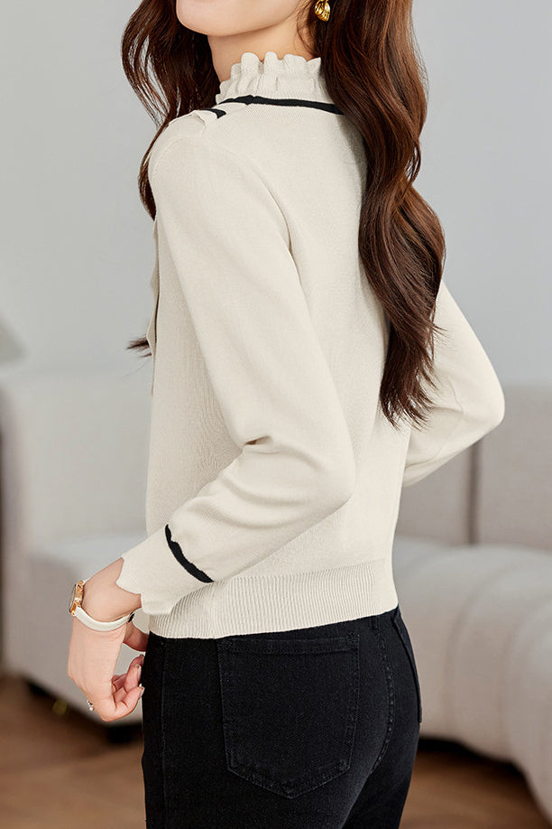 Knitted top, half-high neck long-sleeve loose fit, a circle around the neck, front v-shaped stripes and body with color-block design, front center with decorative non-openable buttons, neckline with gathered ruffled design |