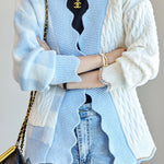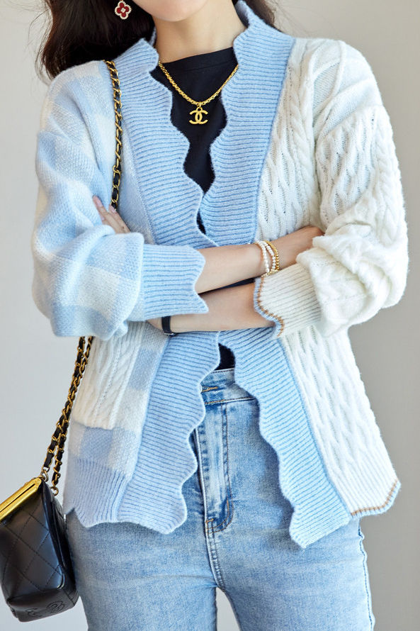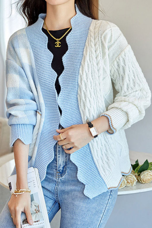 Cardigan, open-front buttonless long-sleeve loose fit, body with asymmetric design, one side with color-block plaid patch pocket, the other side with solid-color knitted ribbed cable pattern |