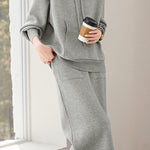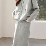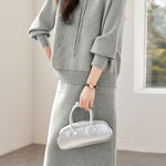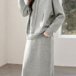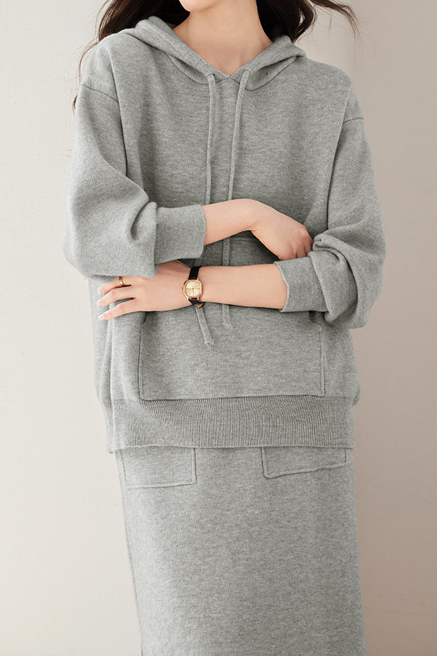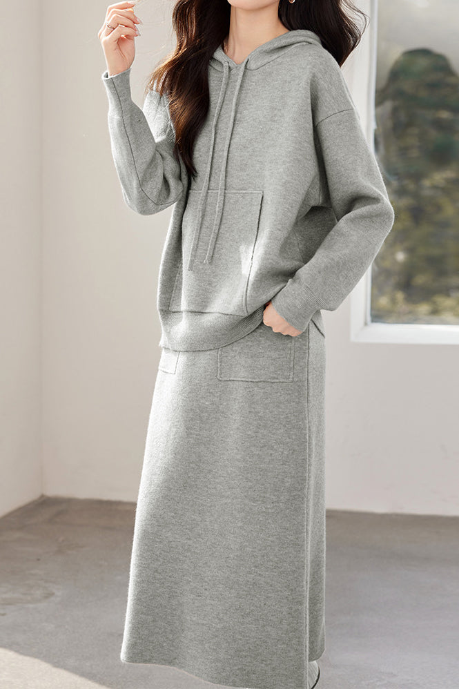 Sweatshirt and midi skirt two-piece set, full-body solid-color wool design, sweatshirt with hood and patch pockets, midi skirt with side patch pockets |