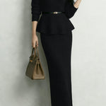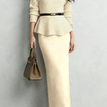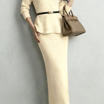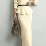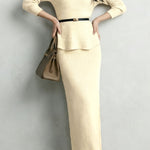 Elegant Off-The-Shoulder Waist-Cinched Straight Long Skirt Knitted Two-Piece Set