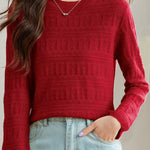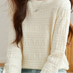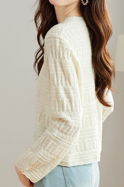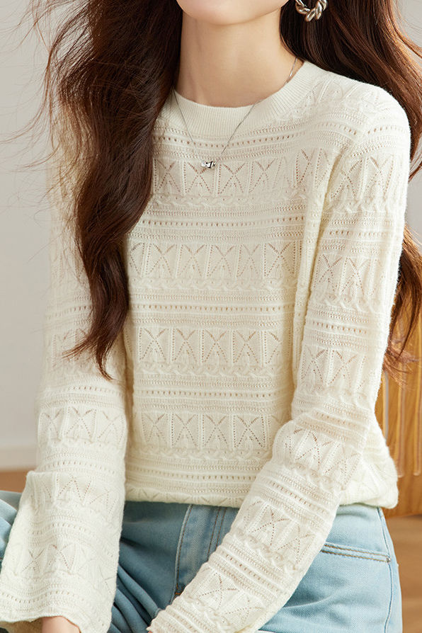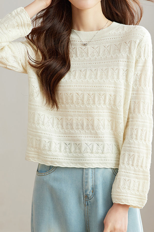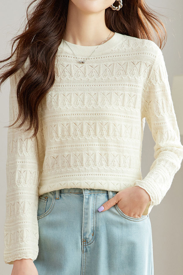 Knitted top, crew neck design, full-body geometric hollow-out jacquard texture for layering, lightweight and breathable fabric