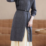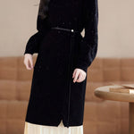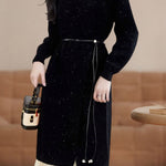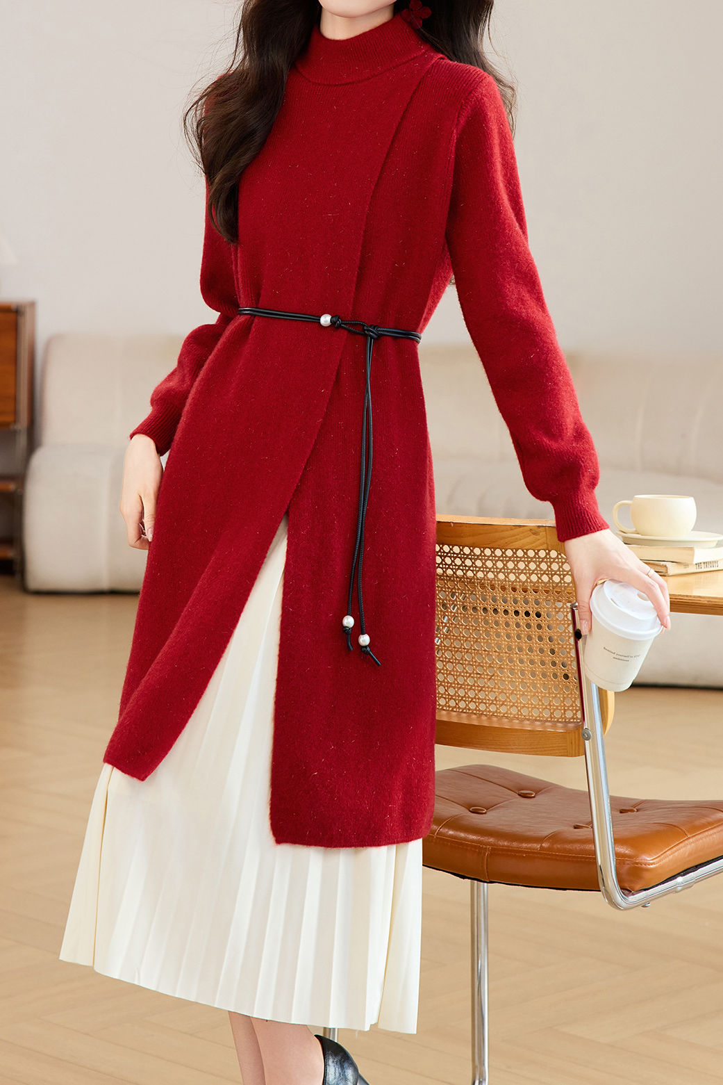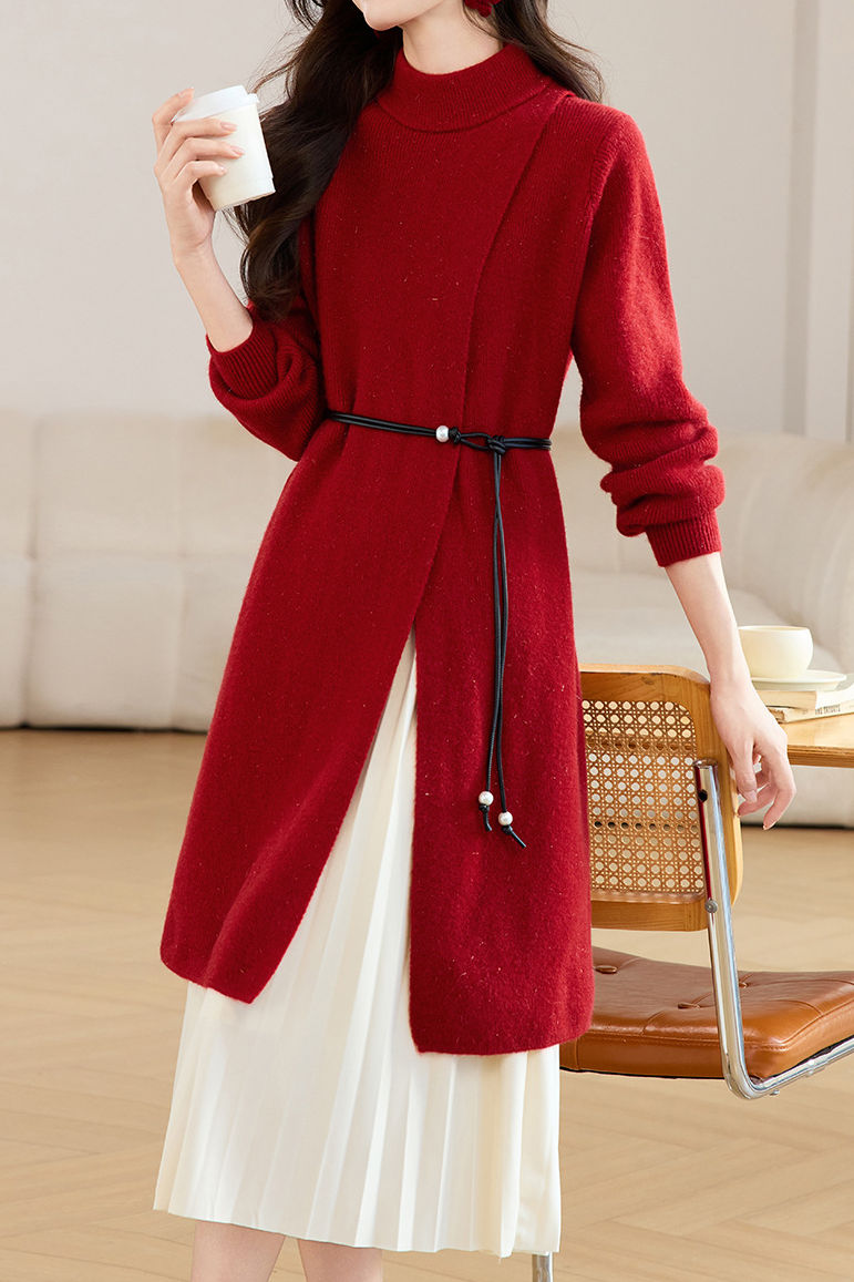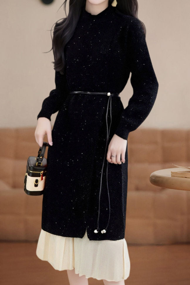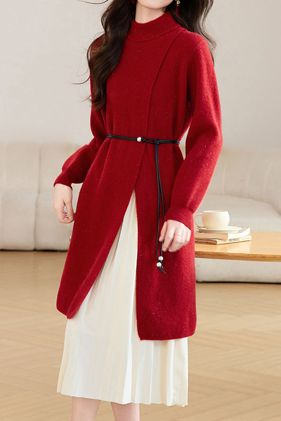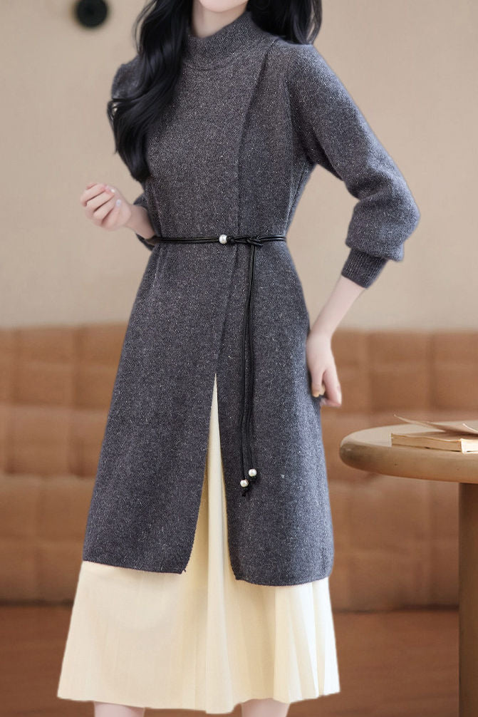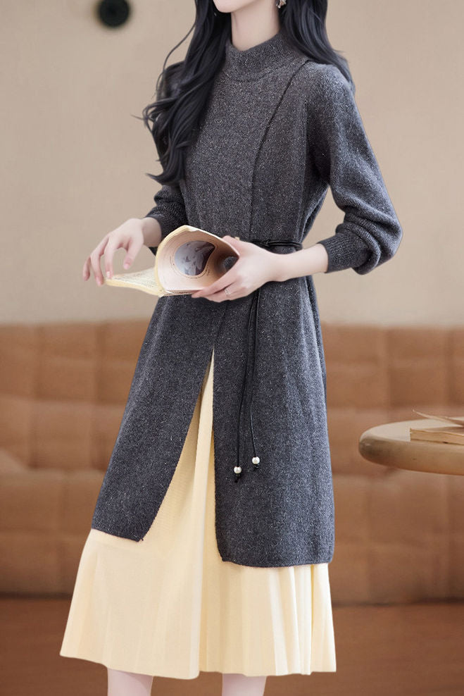 Knitted skirt set, knitted top with half-high neck long-sleeve mid-length loose fit, skirt with a-line loose fit; top with lurex embellishments and side slit from body to hem; skirt with elastic waist pleated design and detachable tie for free styling