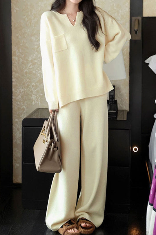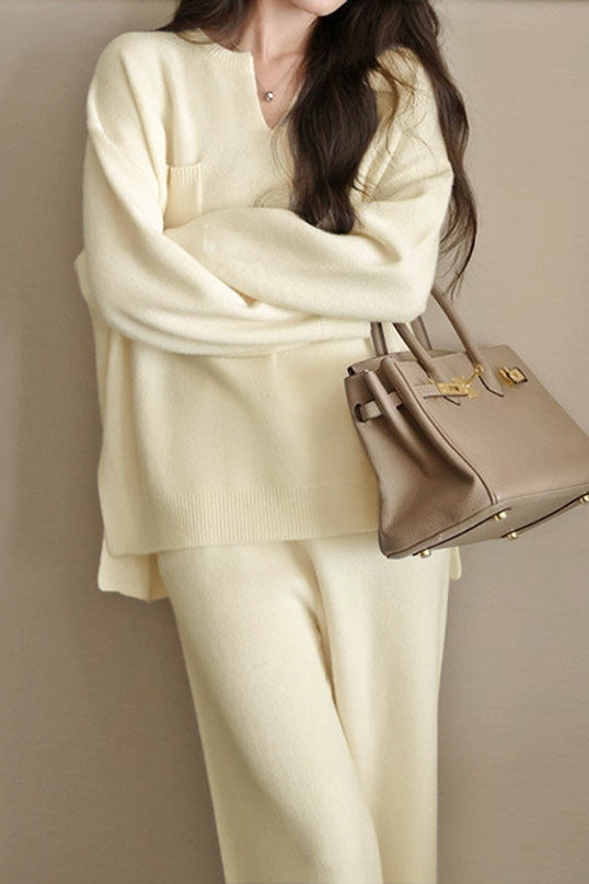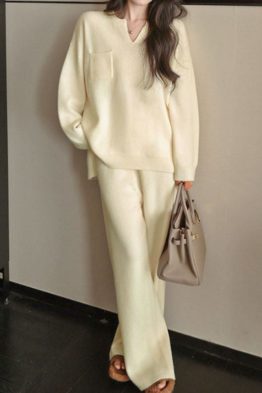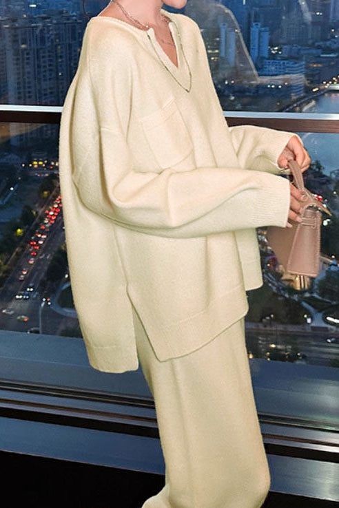 Knitted two-piece set, top with V-neck long-sleeve loose fit, split hem design, chest patch pocket decoration; pants with wide-leg loose fit, elastic waistband, side slash pockets on both sides |