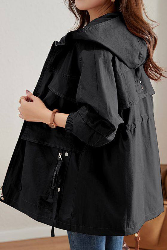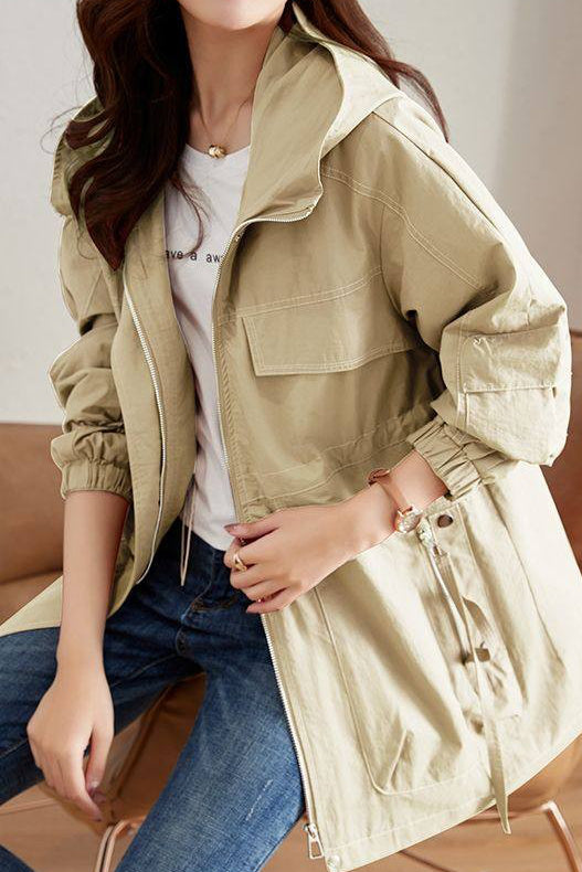 Coat, hooded zipper closure design, multi-pocket utility-style cut, lightweight and breathable fabric, waist drawstring for adjustable cinching, elasticated cuffs for wind protection |
