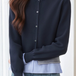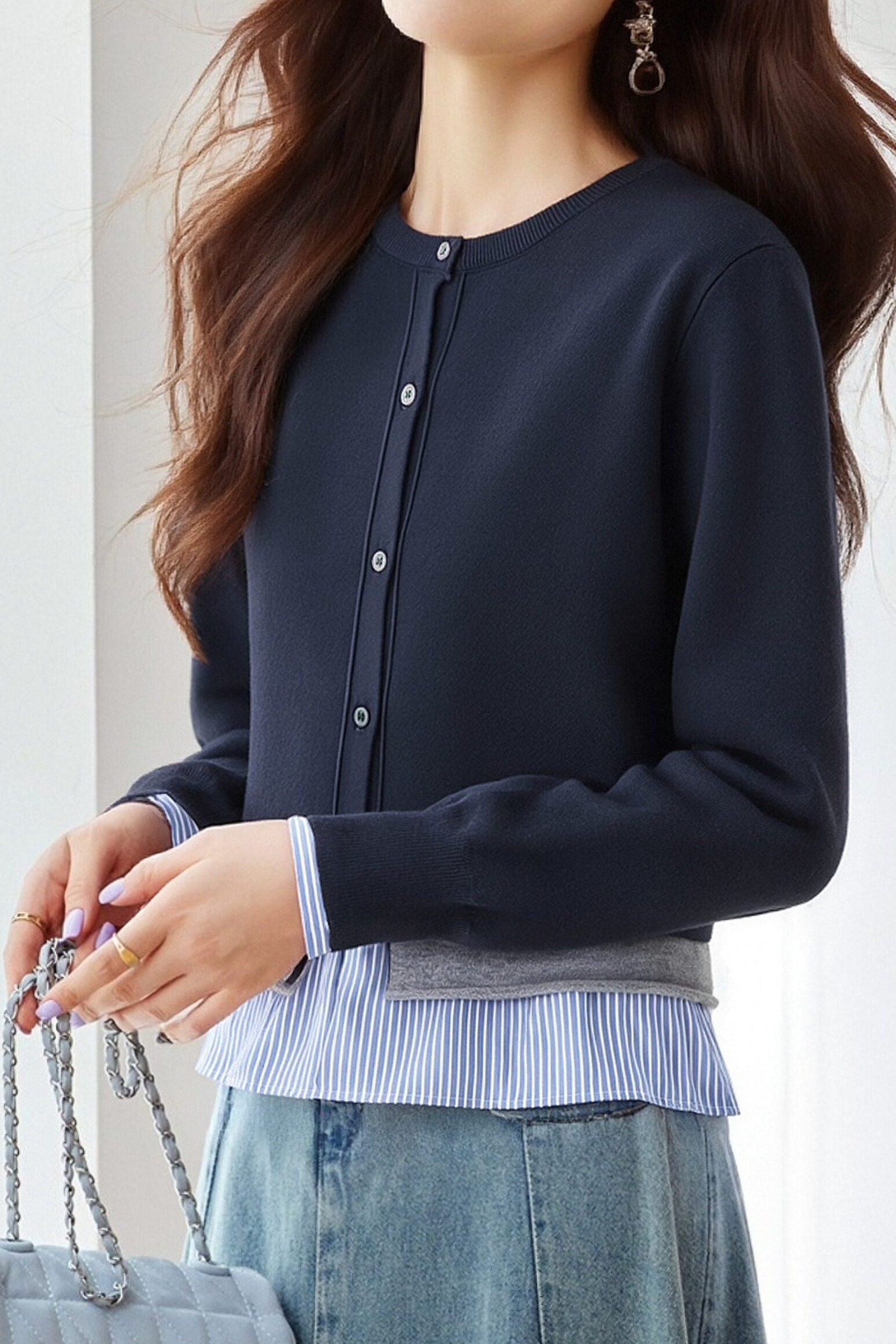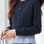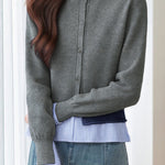 Cardigan, crew neck single-breasted button design, color-block striped patchwork at hem for fake two-piece layered look, soft skin-friendly fabric, cropped cut for proportion enhancement, balances minimalism and design sense