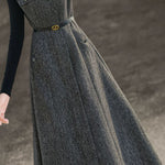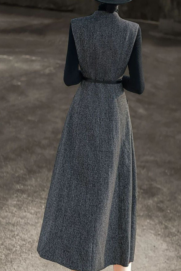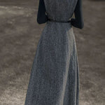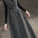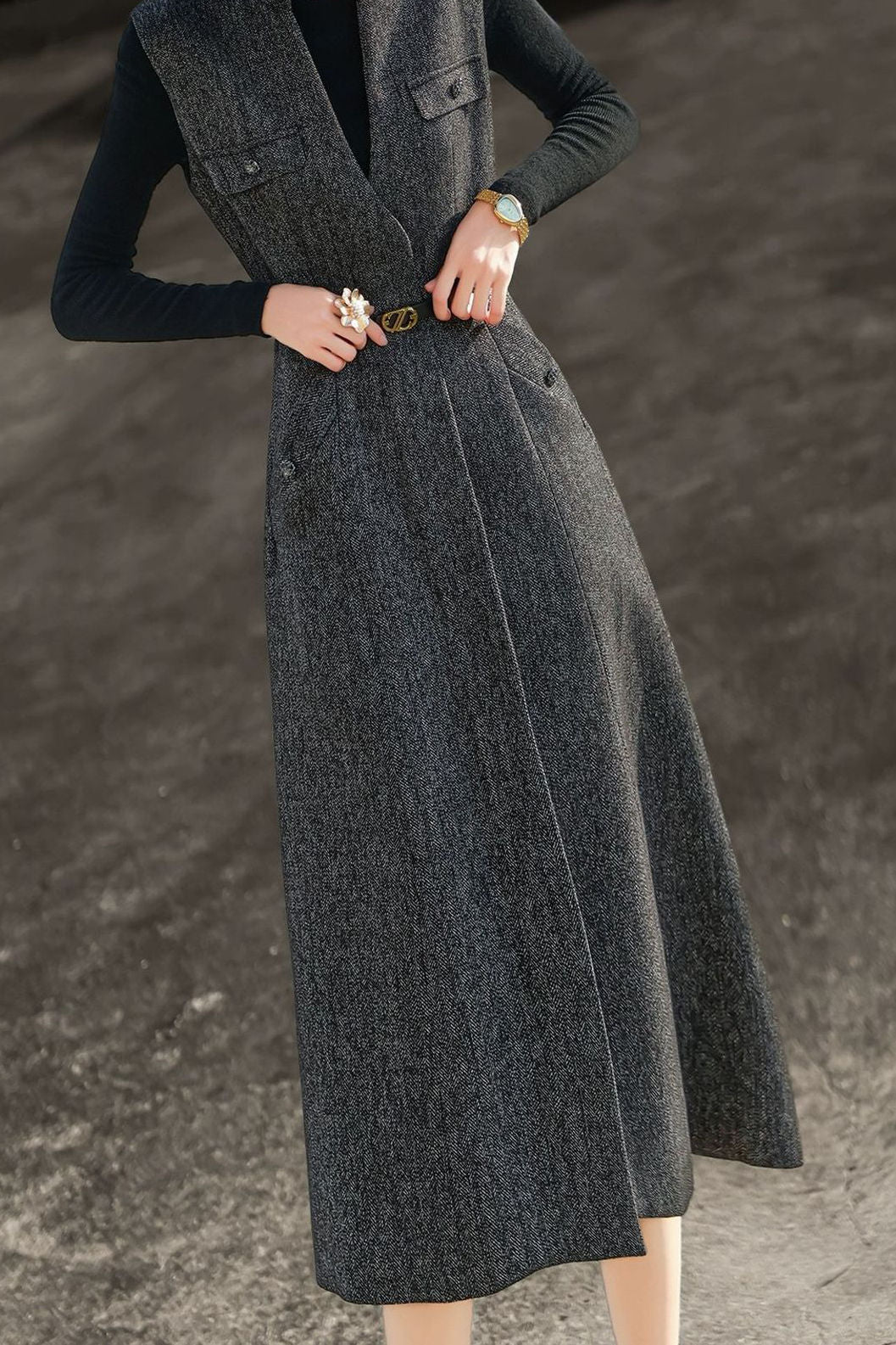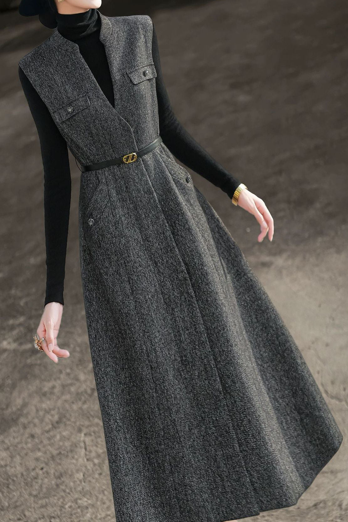 Dress, V-neck sleeveless design, waist belt for cinching and proportion improvement, large drapable skirt hem, structured textured fabric, combines elegant temperament with practicality |