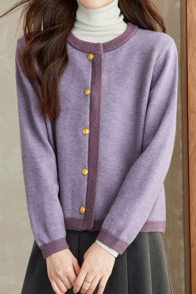 Knitted cardigan, crew neck long-sleeve loose fit, placket with decorative metal buttons, neckline, cuffs and placket hem with color-block ribbed splicing