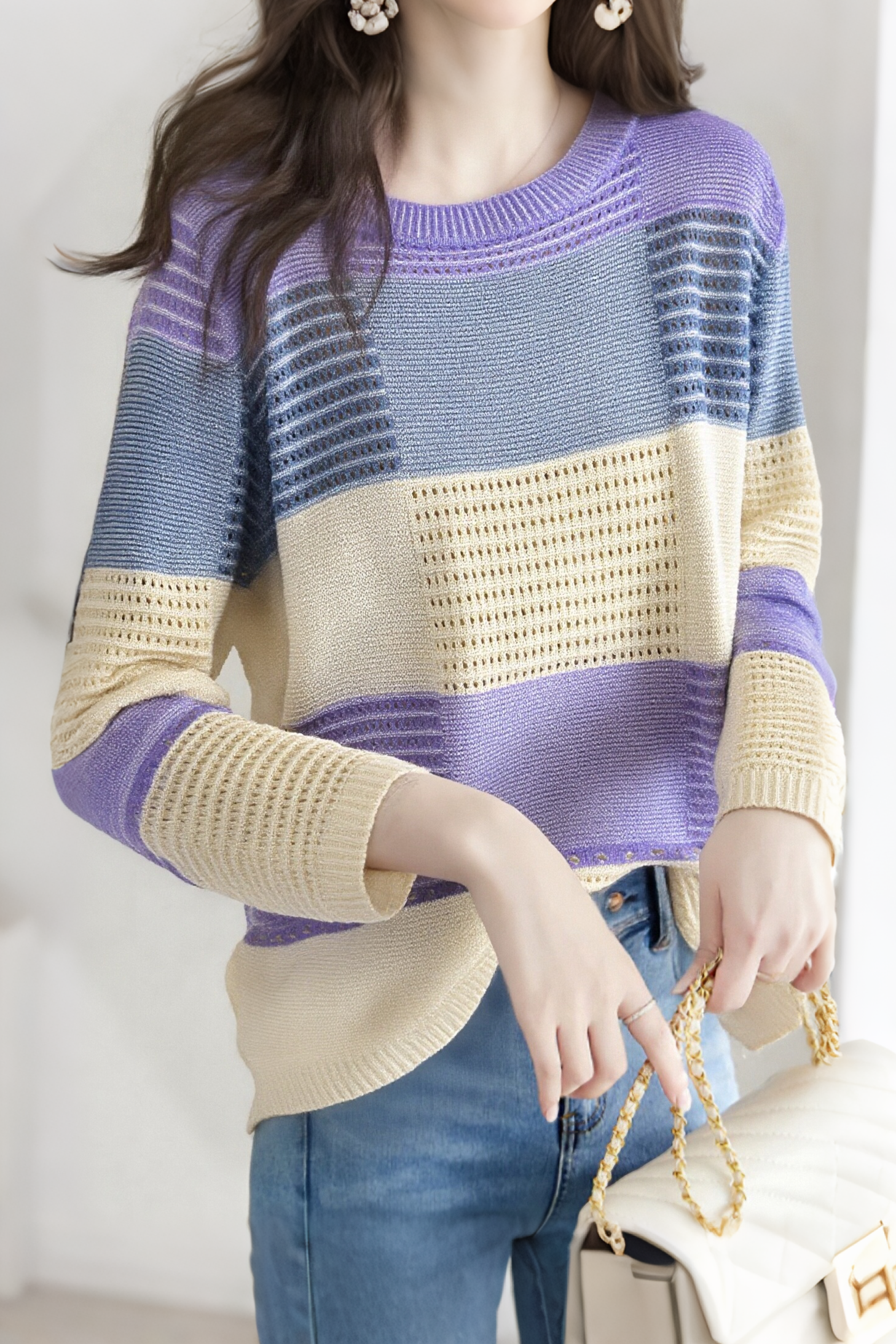 Color-Blocked Loose Striped Hollow-Out Long-Sleeve Knit Top