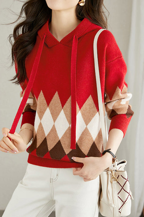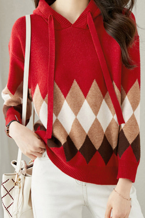 Hooded Geometric Pattern Long Sleeve Knit Top