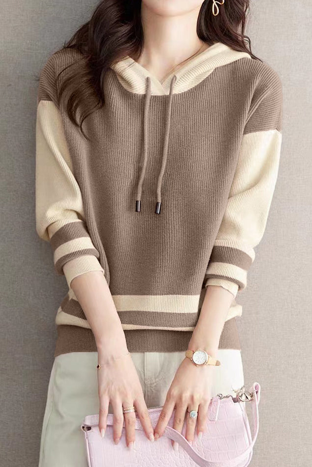 Casual Versatile Color-Block Striped Hooded Knitted Top