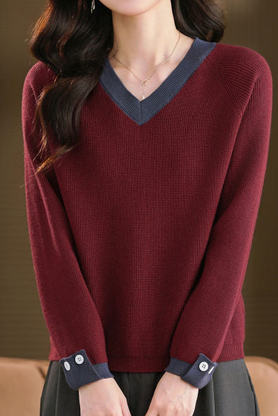 Casual Versatile V-Neck Long-Sleeve Color-Block Knitted Top