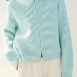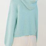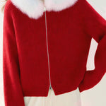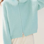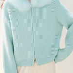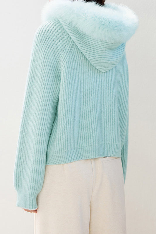 Hooded Knitted Cardigan, hooded long-sleeve loose fit, detachable fur collar, front placket with openable double-ended zipper, raglan sleeve design