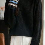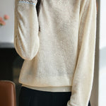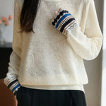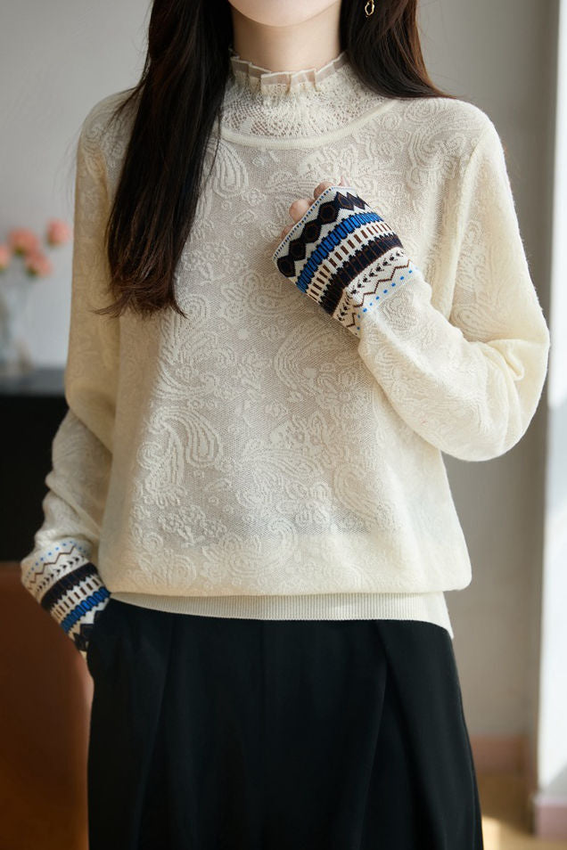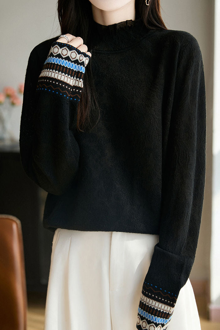 Knitted top, half-high neck design, ruffled trim embellished at neckline for a soft feminine touch, patterned cuffs for layered detail, made of soft and delicate knitted fabric |