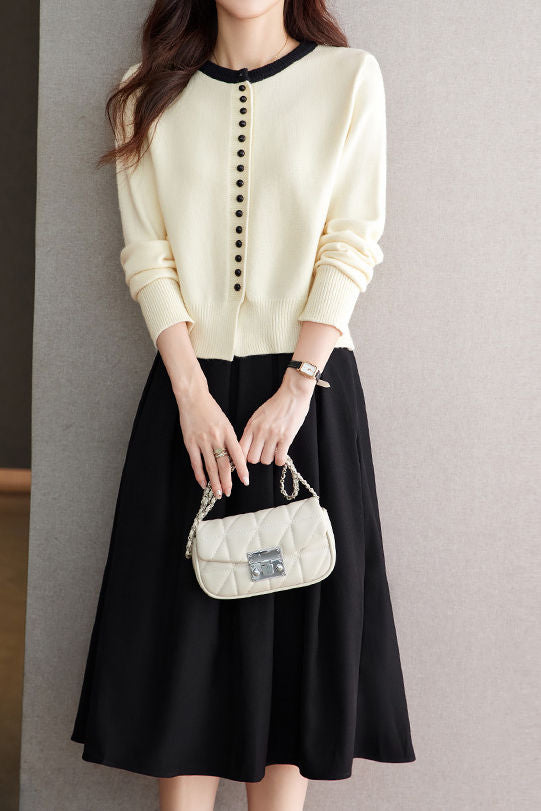 Casual Versatile Color-Block Knitted Cardigan A-Line Skirt 2-Piece Set