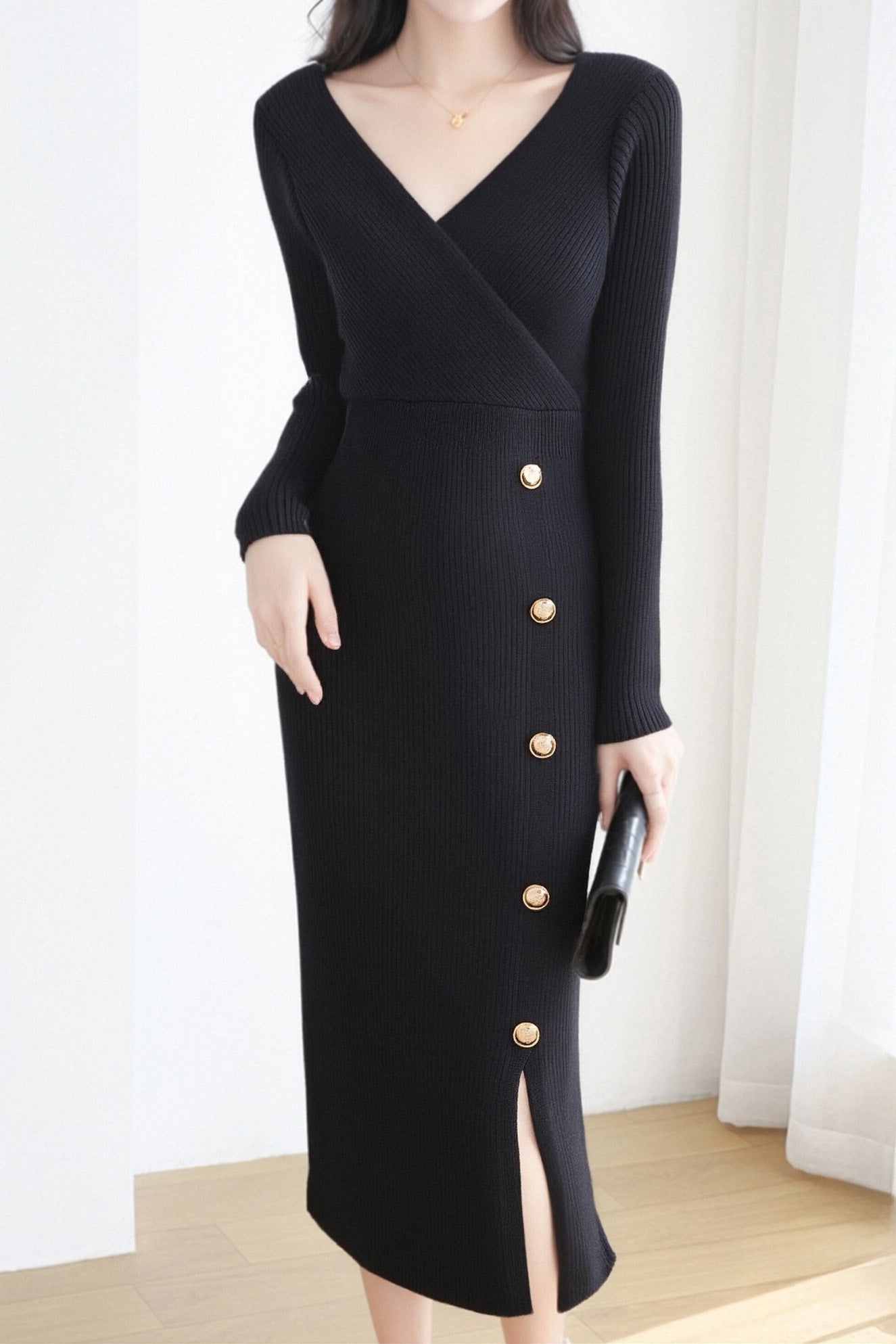 モックネックベルテッドパフスリーブロングニットワンピース 4色入 - liwisi