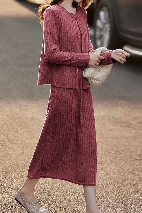 Casual Color-Block Gold Heart Button Knitted Cardigan Dress Two-Piece Set