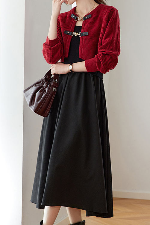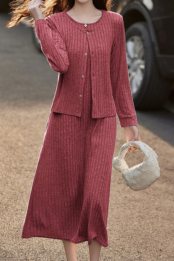 Casual Versatile A-Line Dress And Knitted Cardigan Two-Piece Set