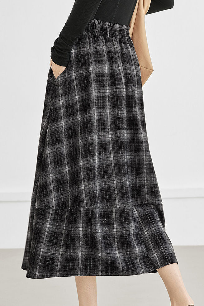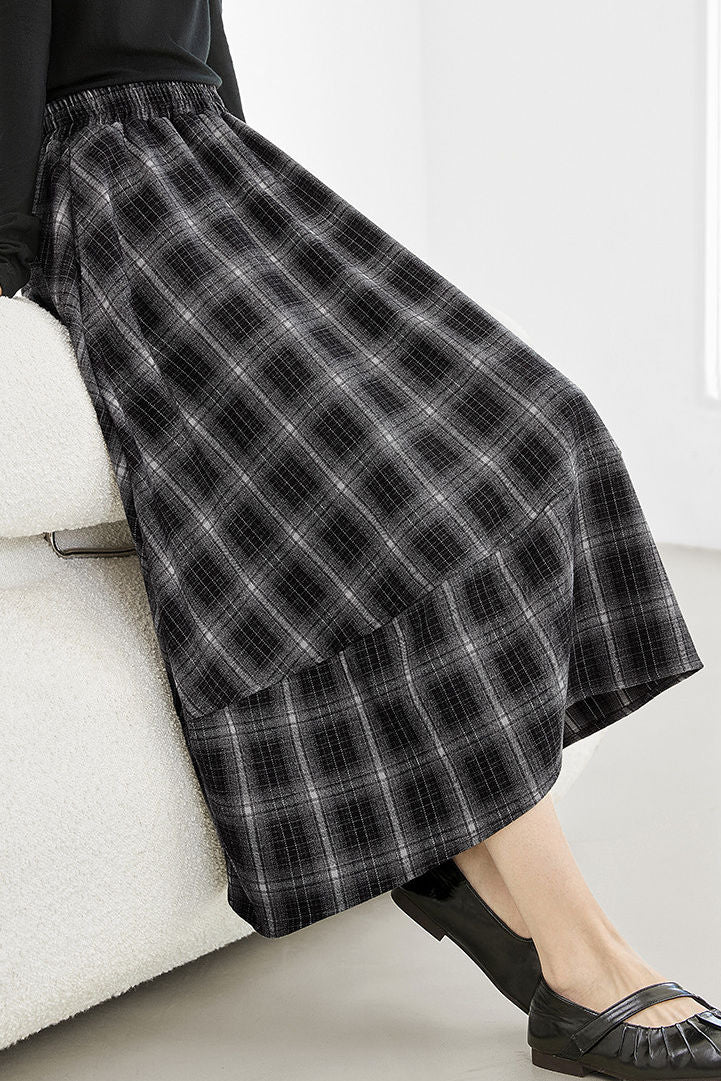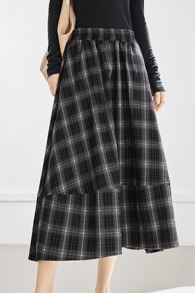 Midi skirt, elastic waistband design, plaid texture for a retro vibe, side slash pockets on both sides, hem with same-fabric patchwork |