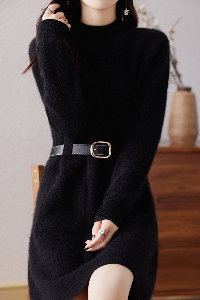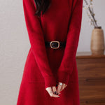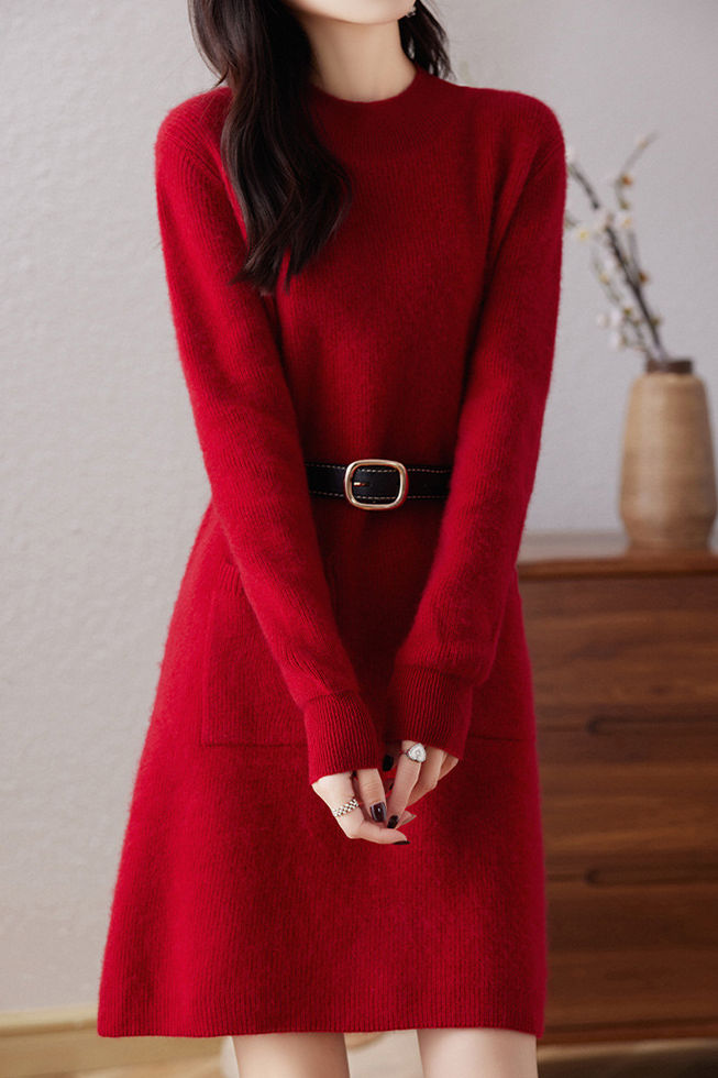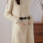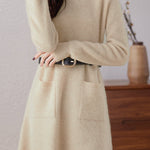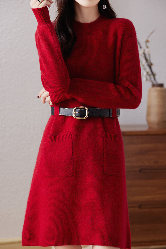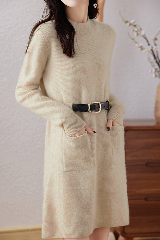 Knitted dress, half-high neck design, vertical knitted texture for a soft and cozy feel, two side patch pockets for practicality, can be paired with a belt to cinch the waist and shape the figure
