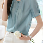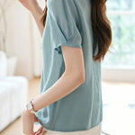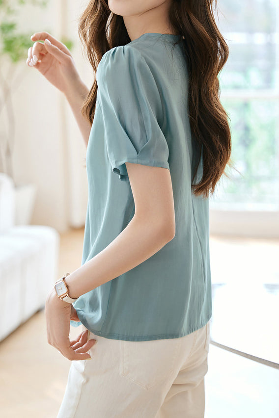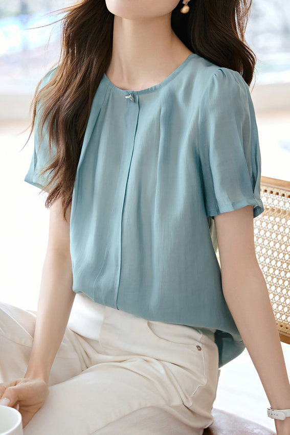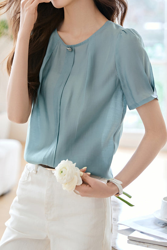 French Fresh Solid Color Shirt,Round Neck,Metal Button Decoration at Collar |