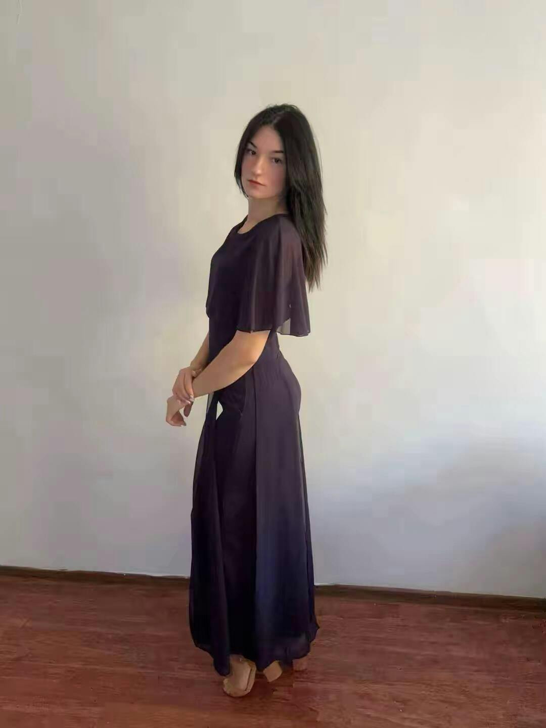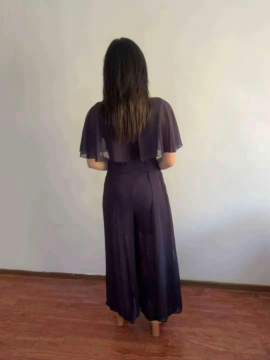 The sheer ruffled sleeves are the absolute star of this piece, creating a beautiful, elegant movement that instantly elevates the look. The silhouette is flawless—the defined waist gives a wonderful shape before flowing into the chic, wide-leg trousers. The material is light and drapes beautifully, making it feel very high-end and comfortable to wear for hours.