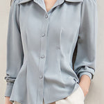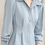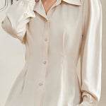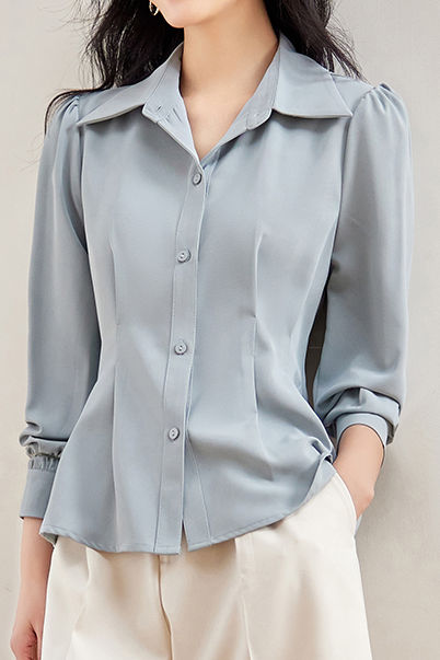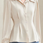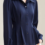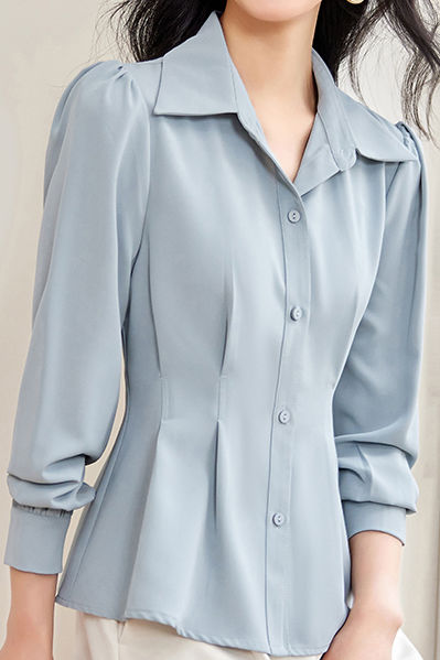 Blouse, Solid Color, Polo Collar Long Sleeves, Front Center Button Closure, Pleated Design Below Waist, Cuff Button Closure |