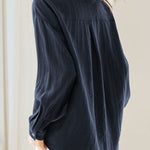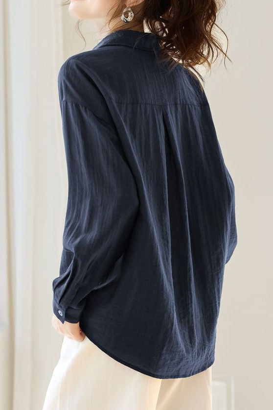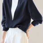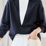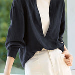 Blouse, Solid Color, Wide V-Neck Loose Fit, Cuff Button Closure, Asymmetrical Hem Design |