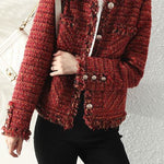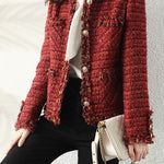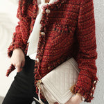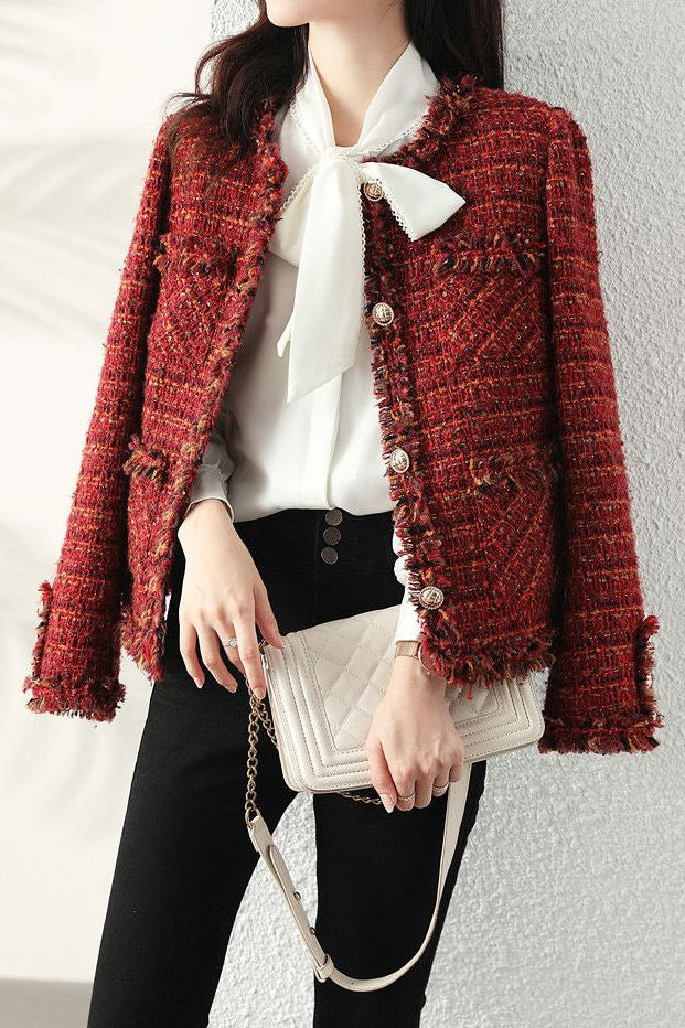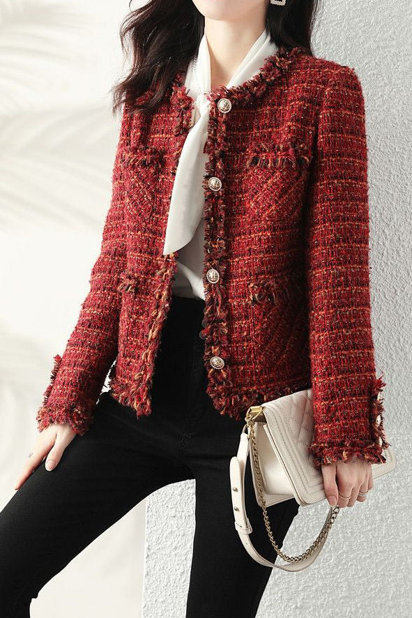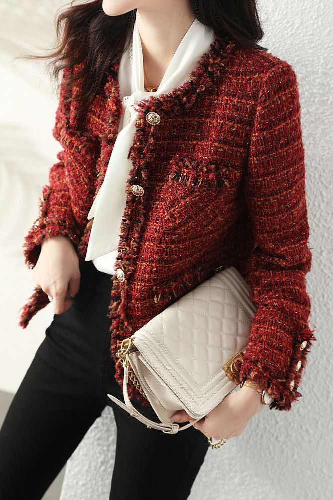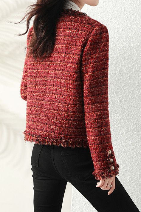 Jacket, Crew Neck Long Sleeves, Metal Button Closure on Placket, Tweed Fabric, Four Pockets on Front Body, Comes with One Extra Button |