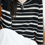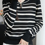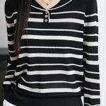 Knit Top, Lapel Collar Long Sleeves, Color-Blocked Striped Design, Decorative Non-Openable Buttons at Front Center |