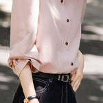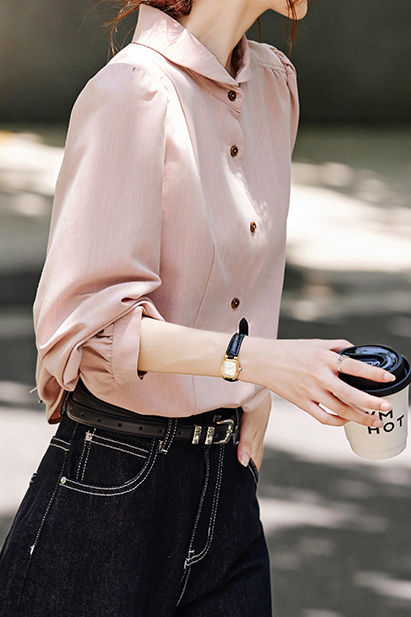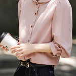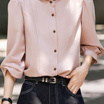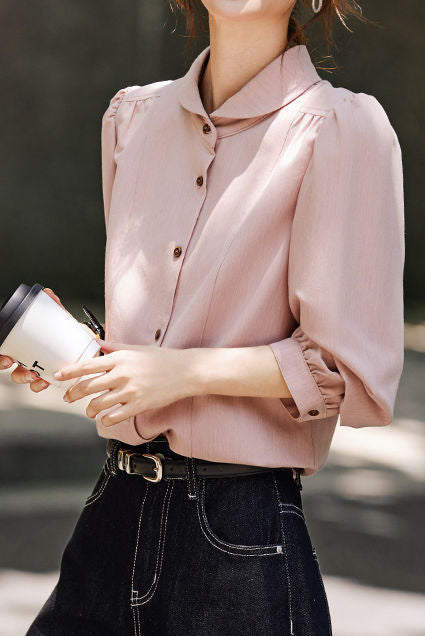 Blouse, Solid Color, Polo Collar Long Sleeves, Button Closure at Front Center, Button Closure Design on Cuffs |