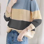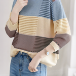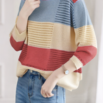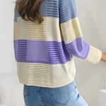 Color-Blocked Loose Striped Hollow-Out Long-Sleeve Knit Top