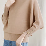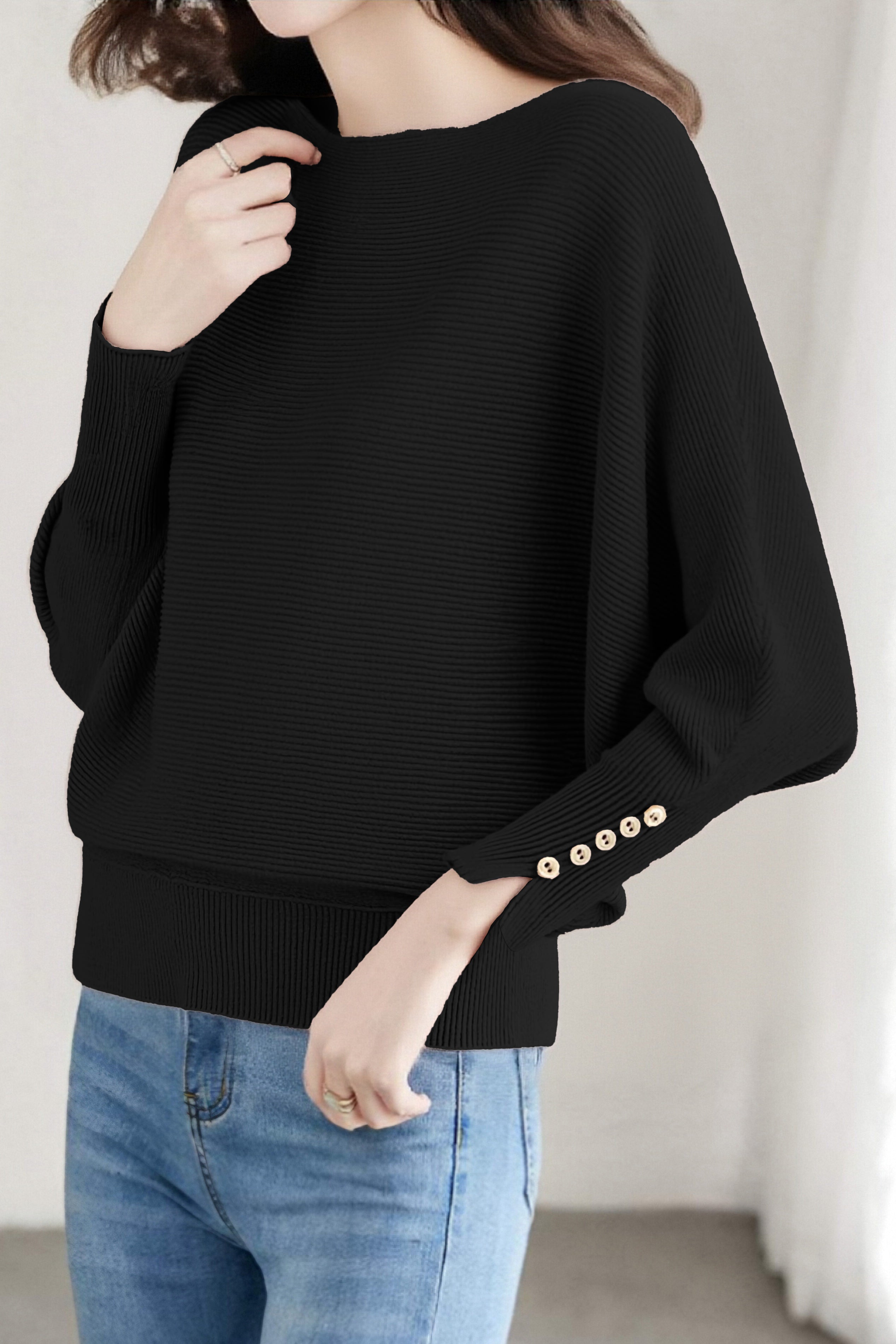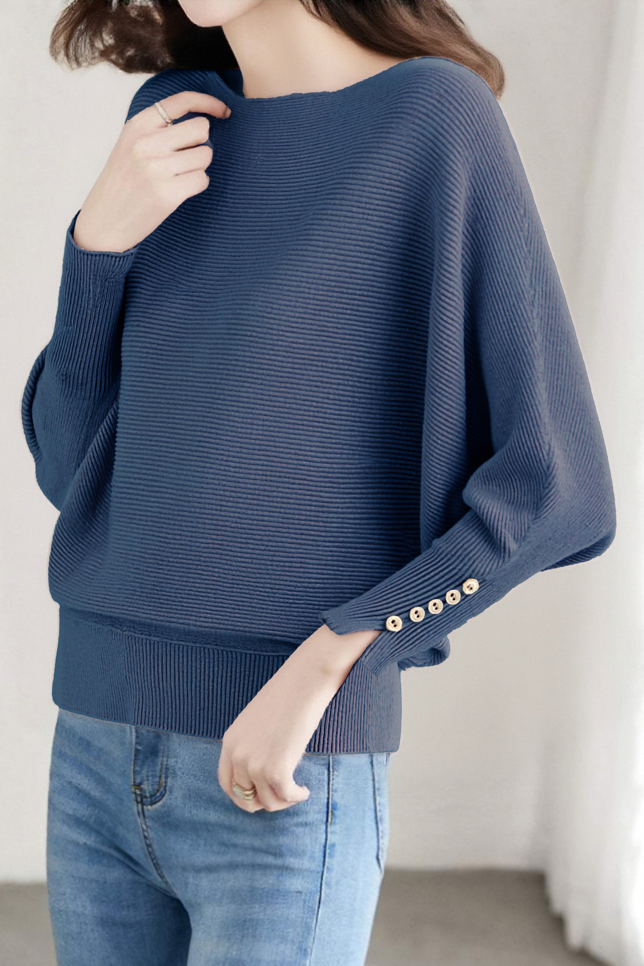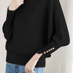 Knit Top, Crew Neck Long Sleeves, Raglan Batwing Sleeves, Loose Fit, Decorative Buttons on Cuffs |