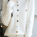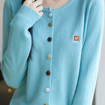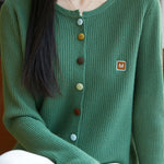 Knit Cardigan, Crew Neck Long Sleeves, Colored Button Design, Openable Buttons on Front Placket, Letter Embroidery Craft on Left Chest |
