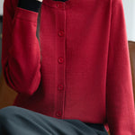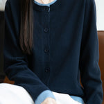 Knit Cardigan, Crew Neck with Openable Front Buttons, Long Sleeves, Fake Two-Piece Color-Blocked Design |