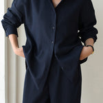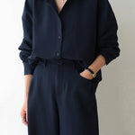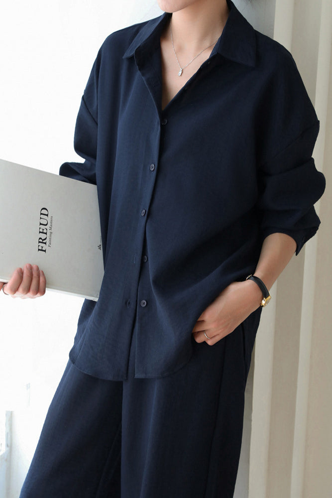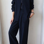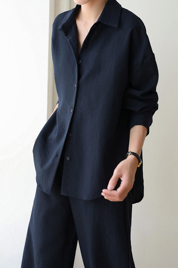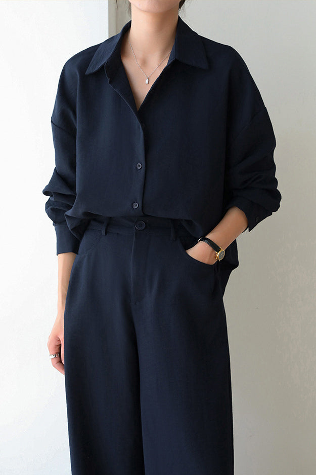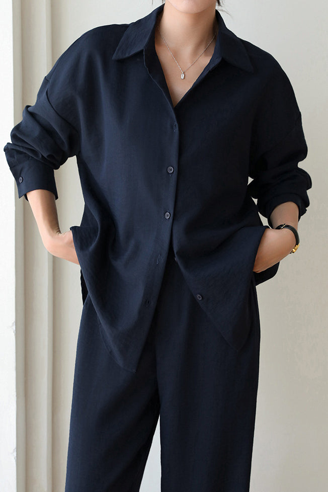 Set: Shirt, Polo long sleeves, solid color, front button closure, cuffs with button closure; Pants, zipper and button design at waist, elastic band at back, pockets on both sides, loose straight fit |