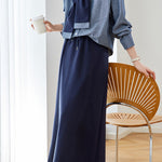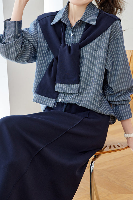 Set: Shirt, Polo long sleeves, striped color, front button closure, cuffs with button closure, left chest pocket design; Skirt, zipper and button design at waist, elastic band at back, adjustable drawstring, loose straight fit, back slit design at hem, paired with a non-stretch sheer shawl |