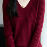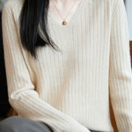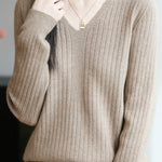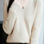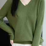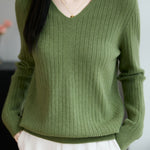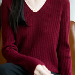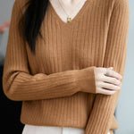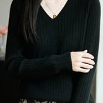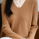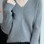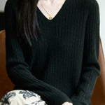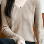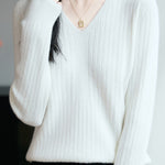 Knit top with V-neck, long sleeves, vertical stripe solid color design |
