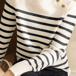 Knit top with round neck, raglan long sleeves, wavy stripe design, loose fit, shoulder metal button decoration |