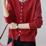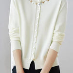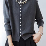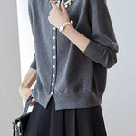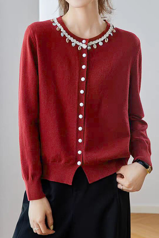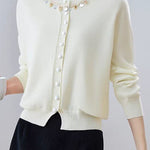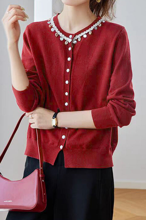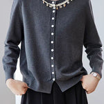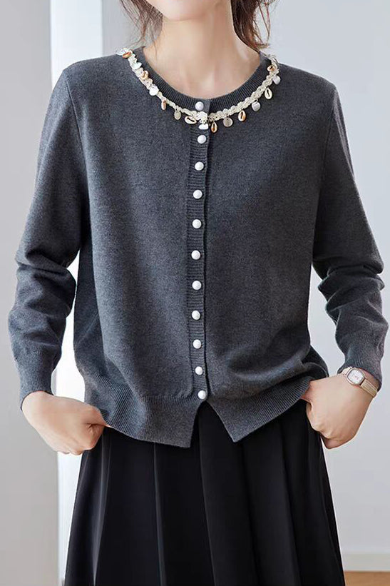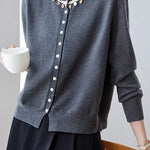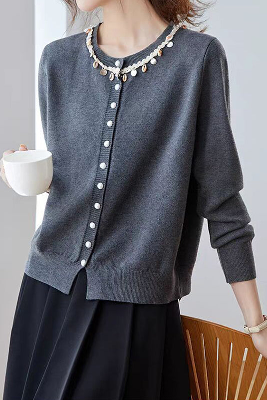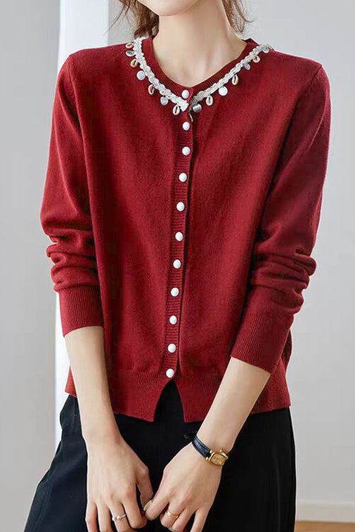 Knit Cardigan with round neck, front button closure, and exquisite shell knit decoration at the neckline, featuring color-block buttons, long sleeves, and a loose fit |