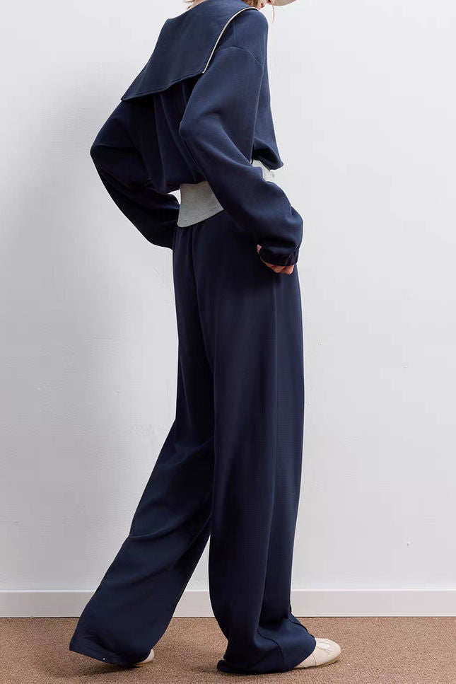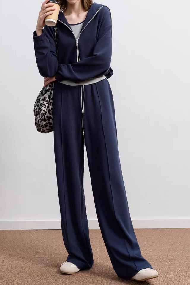 2-piece set,top: half-open placket sailor collar design,front with zipper,hem with elastic adjustable drawstring;inner tank top:color-block trim design;pants:elastic waistband,waist with elastic drawstring,side insert pockets,loose wide-leg fit,front with structural seam |