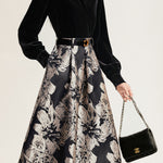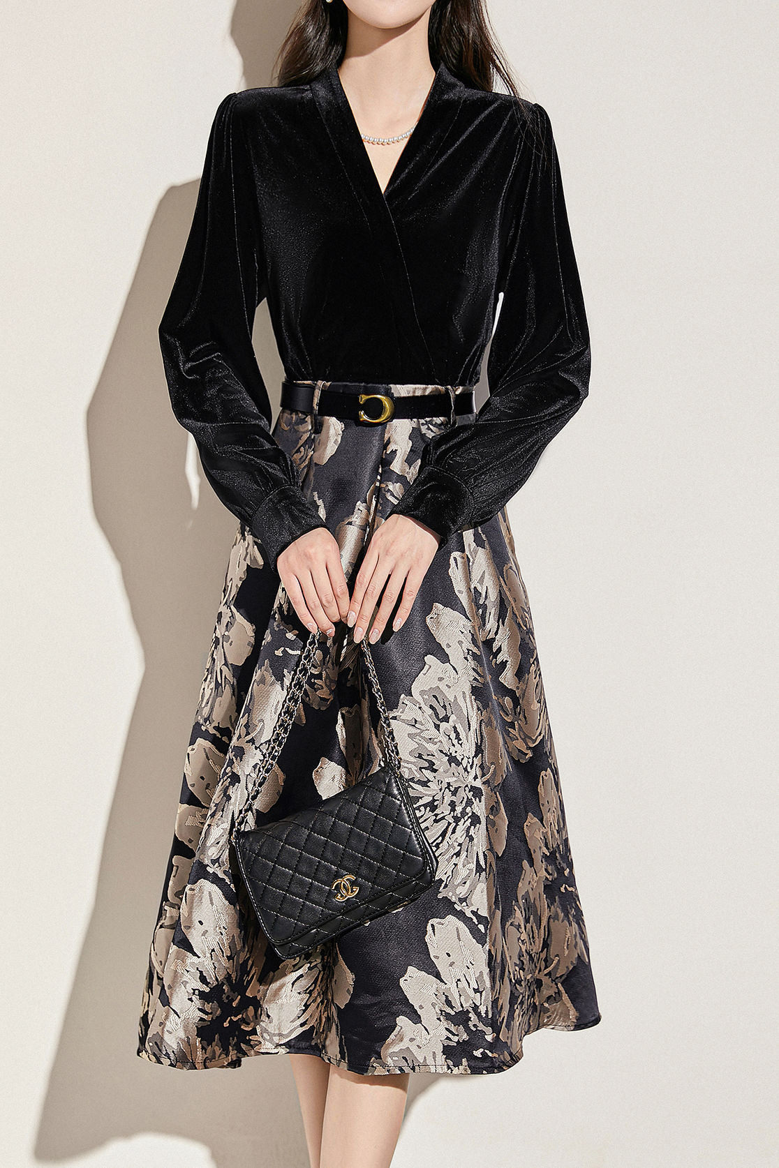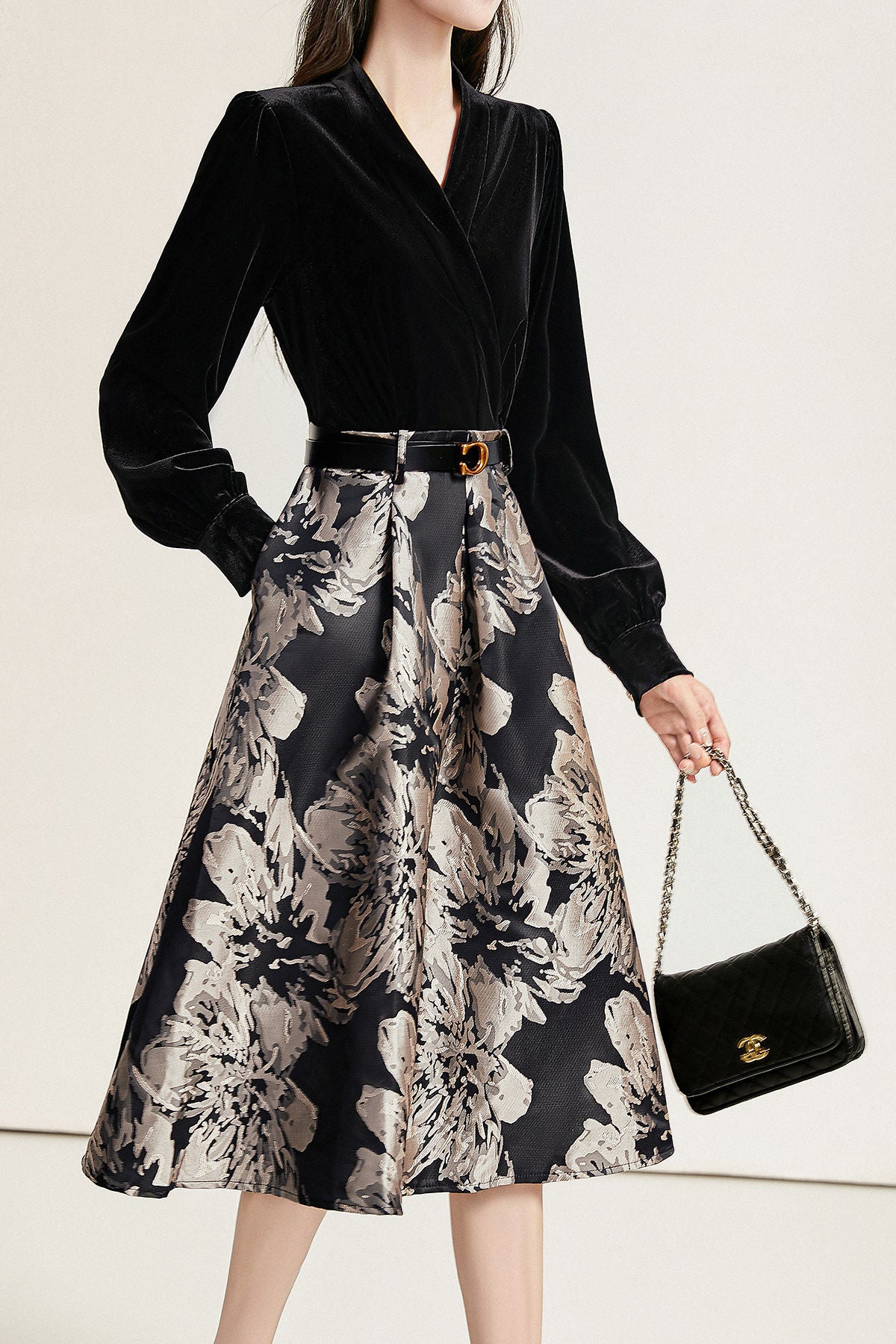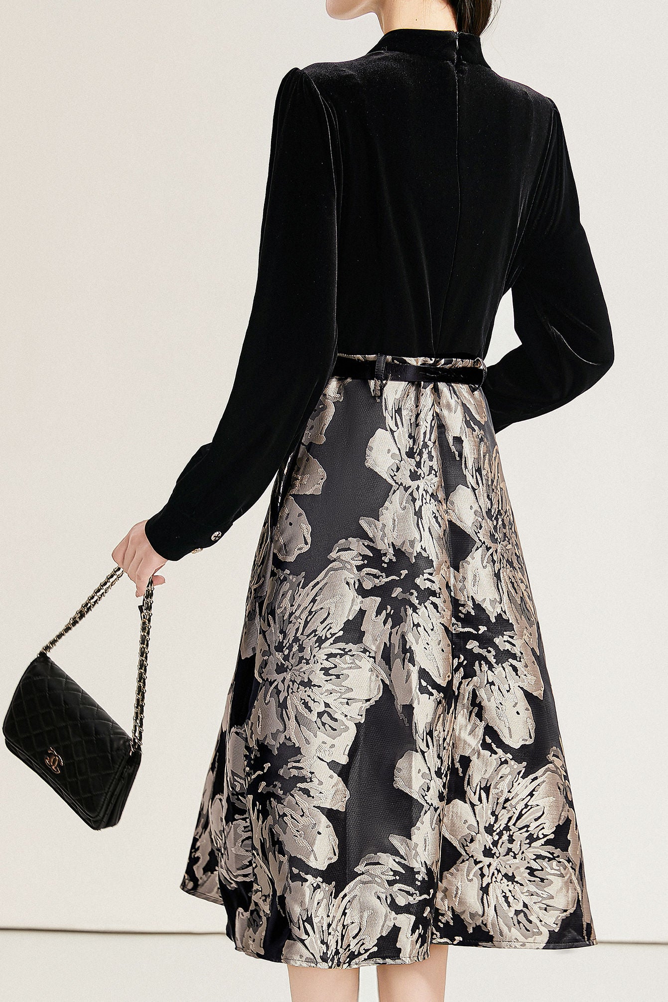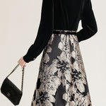 Elegant Velvet-Paneled Jacquard A-Line Dress