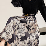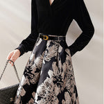 Dress,v-neck long sleeves,waist-cinched a-line fit,artistic large floral pattern,waist with pleats,side insert pockets,cuffs with slits and unbuttonable buttons,back center with invisible zipper,with adjustable belt |