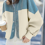 Coat,stand collar loose fit,paneled denim color-block design,front center with openable snap buttons |